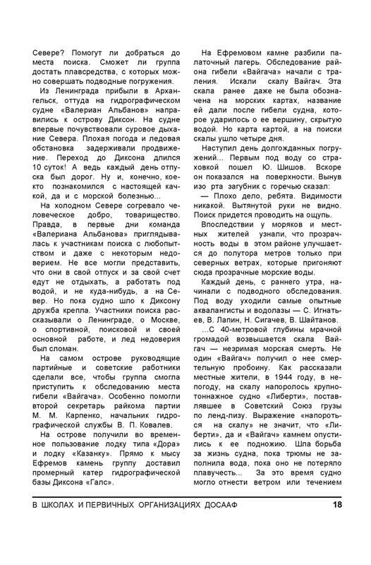 ...С 40-метровой глубины мрачной громадой возвышается скала Вайгач — незримая морская смерть. Не один «Вайгач» получил о нее смертельную пробоину. Как рассказали местные жители, в 1944 году, в непогоду, на скалу напоролось крупнотоннажное судно «Либерти», поставлявшее в Советский Союз грузы по ленд-лизу. Выражение «напороться на скалу» не значит, что «Либерти», да и «Вайгач» камнем опустились к ее подножию. Шла борьба за жизнь судна, пока трюмы не заполнила вода, пока оно не потеряло плавучесть... За это время судно могло отнести ветром или течением в сторону... Словом, был нужен поиск и поиск.