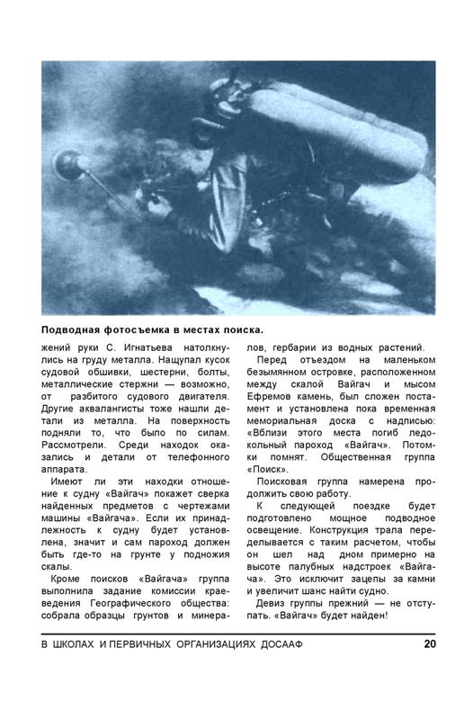 Группа подводного поиска, в состав которой вошли аквалангисты и водолазы спортивно-технических клубов Москвы и Ленинграда, в период летних отпусков начала поиски затонувшего ледокольного парохода «Вайгач». Поисковые работы были организованы при содействии Географического общества Союза ССР.