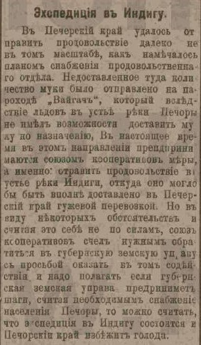 Въ Печерскiй край удалось отправить продовольствiе далеко не въ томъ масштабѣ, какъ намѣчалось планомъ снабженiя продовольственнаго отдѣла. Недоставленное туда количество муки было отправлено на пароходѣ «Вайгачъ», который вслѣдствiе льдовъ въ устьѣ рѣки Печоры не имѣлъ возможности доставить муку по назначенiю, Въ настоящее время въ этомъ направленiи предпринимаются союзомъ кооперативовъ мѣры, а именно: отправить продовольствiе въ устьѣ рѣки Индиги, откуда оно могло бы быть вполнѣ доставлено въ Печорскiй край гужевой перевозкой. Но въ виду нѣкоторыхъ обстоятельствъ и считая это себѣ не по силамъ, союзъ кооперативовъ счелъ нужнымъ обратиться въ губернскую земскую управу съ просьбой оказать въ томъ содѣйствiя, и надо полагать если губернская земская управа предприниметъ шаги, считая необходимымъ снабженiе населения Печоры, то можно считать, что экспедицiя въ Индигу состоится и Печорскiй край избѣжитъ голода.