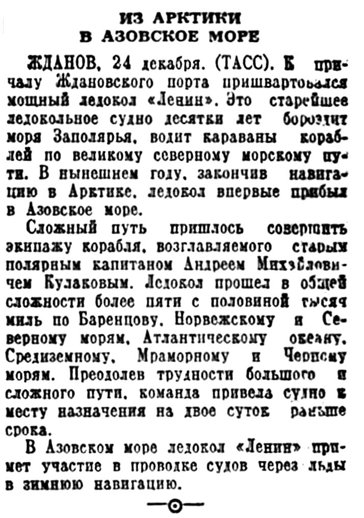 ЖДАНОВ, 24 декабря. (ТАСС). К причалу Ждановского порта пришвартовался мощный ледокол «Ленин». Это старейшее ледокольное судно десятки лет бороздит моря Заполярья, водит караваны кораблей по великому северному морскому пути. В нынешнем году, закончив навигацию в Арктике, ледокол впервые прибыл в Азовское море.