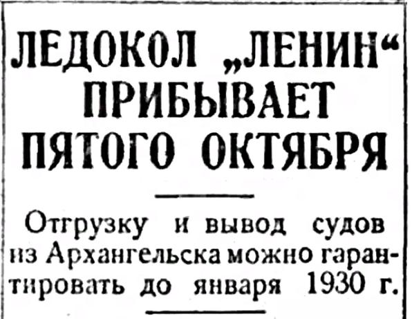 Ленинградский корр. "Вечерней Москвы"* сообщает, что утром 15-го октября ледокол "Ленин" ушел в Архангельск. Ленинградский порт передает ледокол в распоряжение ЦУМОР для работы на Севере. В Архангельске «Ленин» будет занят проводкой лесоэкспортных судов сквозь льды и удлинит своей работой срок навигации. Ледокол в Архангельск ведет "красинец" капитан Эгге.