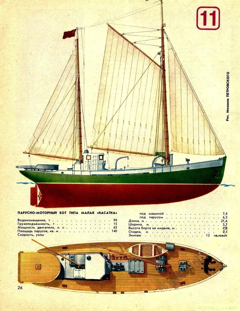 Правда, первое время дефицитом оставались моторы и главным движителем «Касаток» стали паруса, размещенные на двух мачтах: стаксель площадью 32 м2, грот (74 м2) и бизань (34 м2). Под ними в свежую погоду парус но-моторный бот развивал скорость до 6,5 узла, а то и больше.