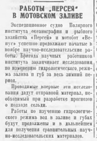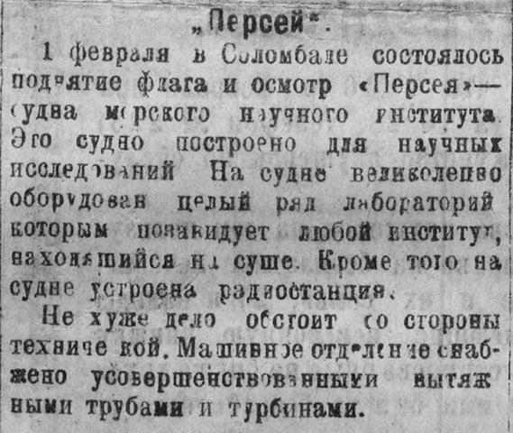1 февраля в Соломбале состоялось поднятие флага и осмотр "Персея"» — судна морского научного института. Это судно построено для научных исследований. На судне великолепно оборудован целый ряд лабораторий которым позавидует любой институт, находящийся на суше. Кроме того на судне устроена радиостанция.