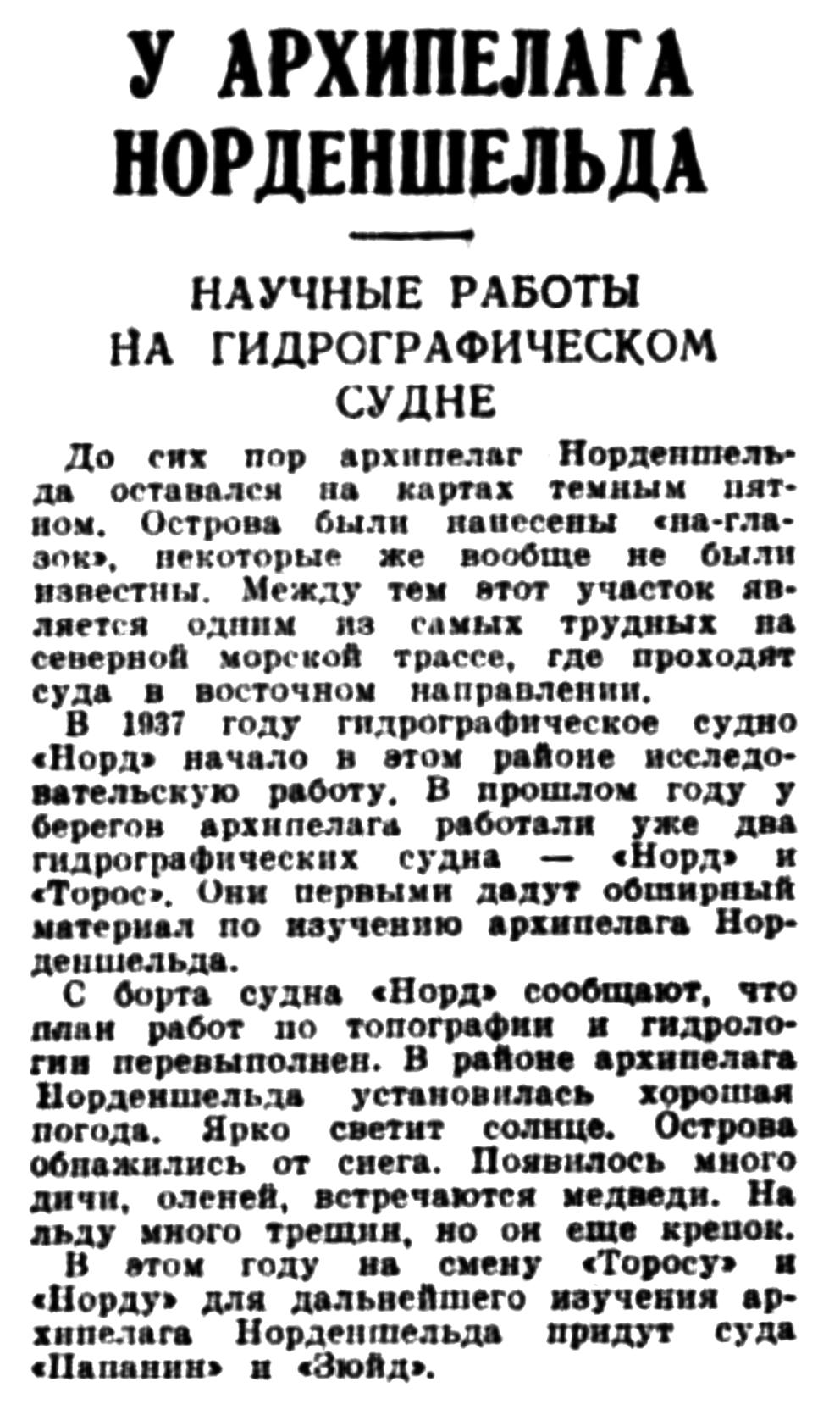 Известия, 1939, № 226 (6996), 29 сентября.Изучение архипелага НорденшельдаАРХАНГЕЛЬСК, 28 сентября. (По телеф. от соб. корр.). В Архангельск после 13½ месяцев пребывания в Арктике возвратилась экспедиция, зимовавшая на гидрографическом судне «Торос» в архипелаге Норденшельда (восточная часть Карского моря). Вместе с экспедицией на гидрографическом судне «Норд» советские полярники, зимовавшие на «Торосе», успешно выполнили программу изучения этой группы островов.