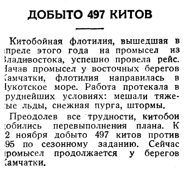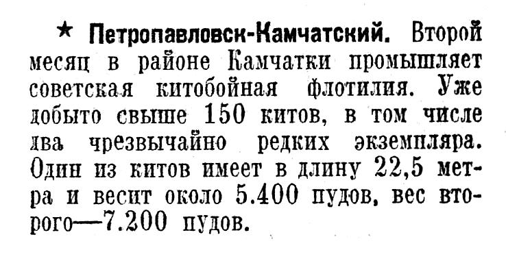 Петропавловск-Камчатский. Второй месяц в районе Камчатки промышляет советская китобойная флотилия. Уже добыто свыше 150 китов, в том числе два чрезвычайно редких экземпляра. Один из китов имеет в длину 22,5 метра и весит около 5.400 пудов, вес второго — 7.200 пудов.