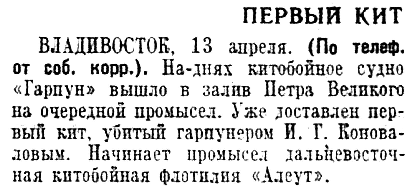 Прошли всего лишь 2 сезона шестимесячной охоты на китов в наших дальневосточных водах но уже достигнуты хорошие результаты. В 1933 г. были убиты 202 кита, а в этом году — ЗЗ9. Добыча такого количества китов дала возможность вытопить в этом году 2.028 тони сала, заготовить 160 тонн китового уса и зуба и выработать 4.403 ящика консервов.