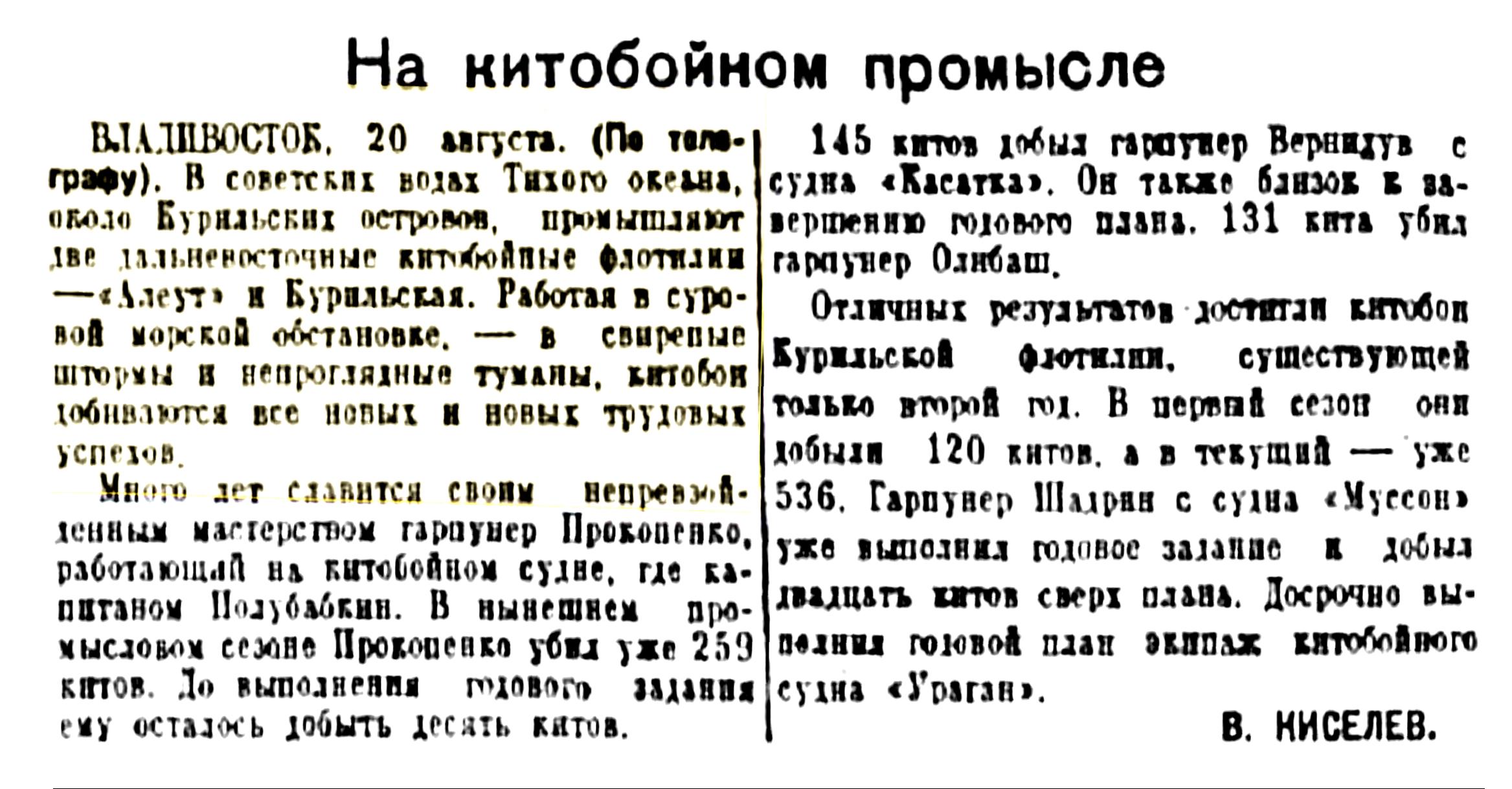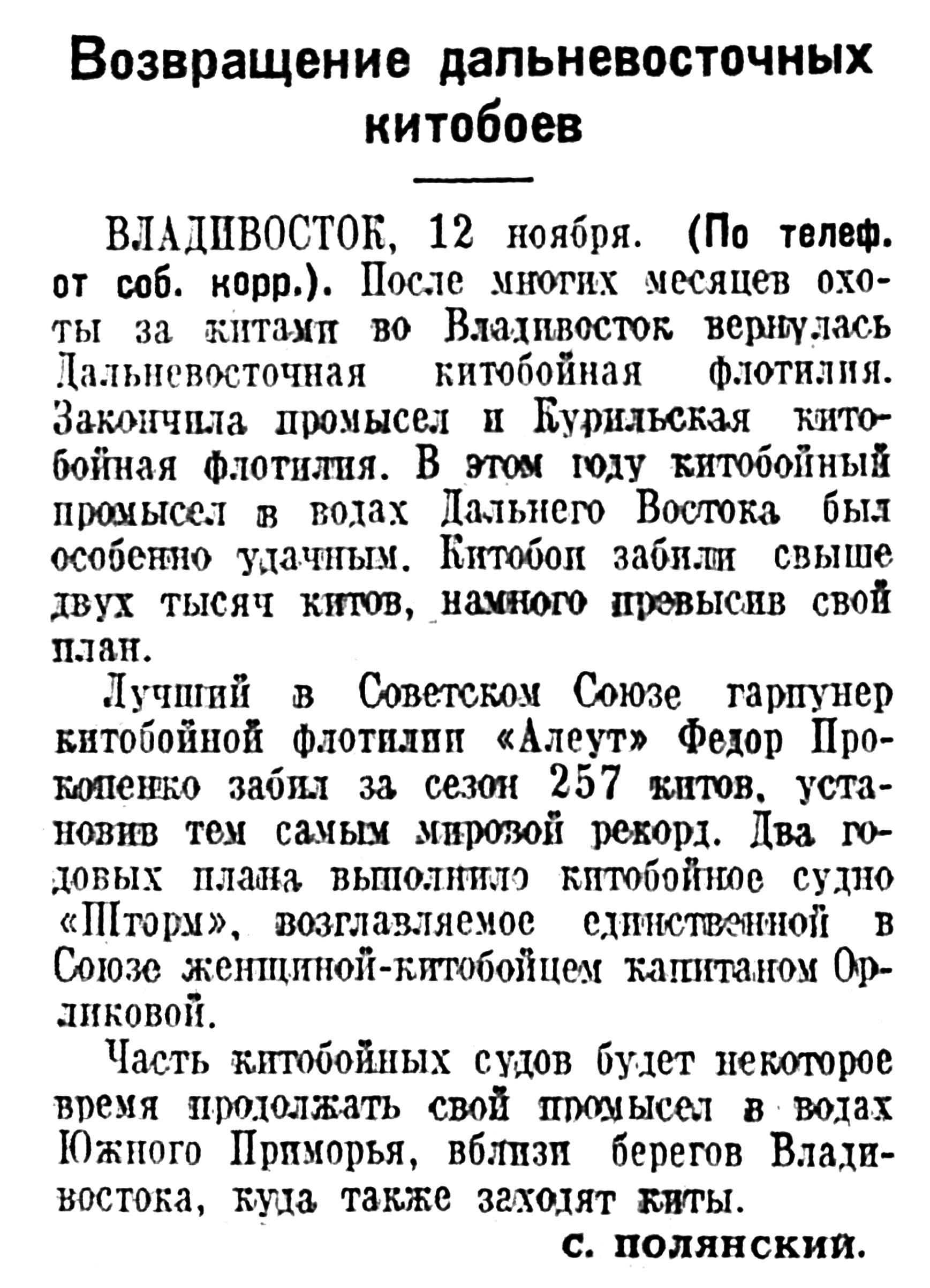 Сегодня мы печатаем корреспонденцию А. Томилина «Охота на китов», в которой автор между прочим сообщает, что в этом году советской китобойной флотилией среди других китов добыто 150 финвалов, достигающих в длину 22 метров.