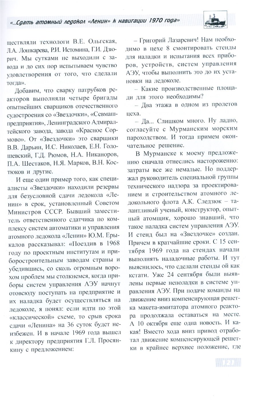 — Григорий Лазаревич! Нам необходимо в цехе 8 смонтировать стенды для наладки и испытания всех приборов, устройств, систем управления АЗУ. чтобы выполнить это до их установки на ледоколе.