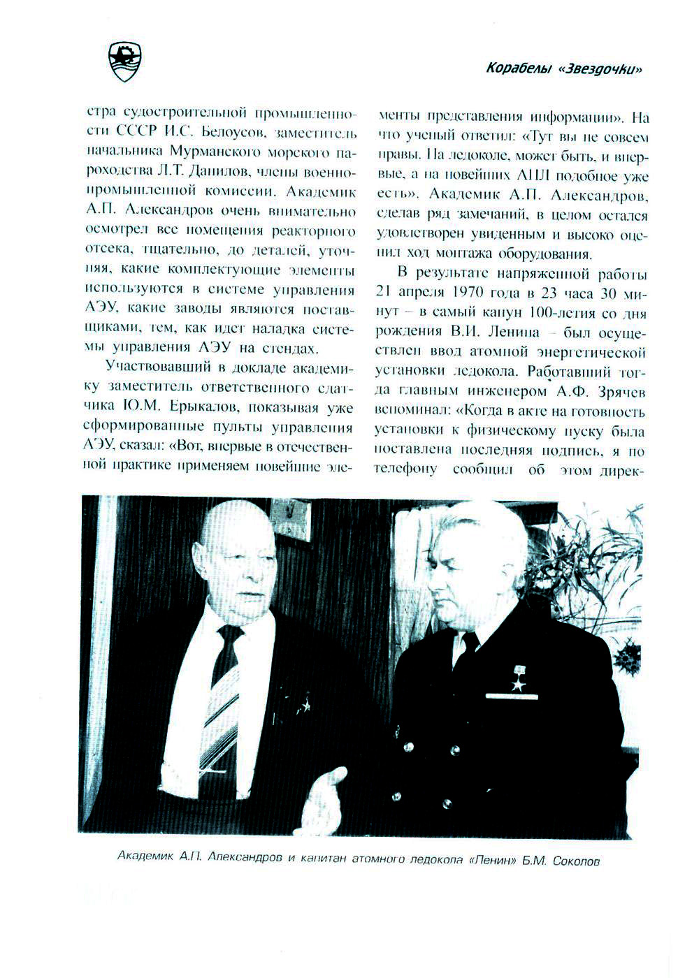 В начале 1970 года атомный ледокол «Ленин» посетили академик А. П. Александров, заместитель министра судостроительной промышленности СССР И. С. Белоусов. заместитель начальника Мурманского морскою пароходства Л. T. Данилов, члены военно-промышленной комиссии. Академик Л. П. Александров очень внимательно осмотрел все помещения реакторного отсека, тщательно, до деталей, уточняя, какие комплектующие элементы используются в системе управления АЭУ, какие заводы являются поставщиками, тем, как идет наладка системы управления АЭУ на стендах.