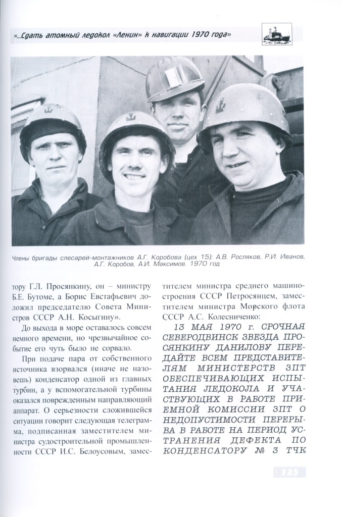 13 МАЯ 1970 г. СРОЧНАЯ СЕВЕРОДВИНСК ЗВЕЗДА ПРОСЯНКИНУ ДАНИЛОВУ ПЕРЕДАЙТЕ ВСЕМ ПРЕДСТАВИТЕЛЯМ МИНИСТЕРСТВ ЗПТ ОБЕСПЕЧИВАЮЩИХ ИСПЫТАНИЯ ЛЕДОКОЛА И УЧАСТВУЮЩИХ В РАБОТЕ ПРИЕМНОЙ КОМИССИИ ЗПТ О НЕДОПУСТИМОСТИ ПЕРЕРЫВА В РАБОТЕ НА ПЕРИОД УСТРАНЕНИЯ ДЕФЕКТА ПО КОНДЕНСАТОРУ № 3 ТЧКВСЕМ ПРЕДСТАВИТЕЛЯМ МСП ЗПТ МСМ ЗПТ ММФ И ДРУГИХ МИНИСТЕРСТВ ОСТАВАТЬСЯ НА МЕСТАХ И ОКАЗАТЬ НЕОБХОДИМУЮ ПОМОЩЬ В РАБОТЕ КОМИССИИ ПОД ПРЕДСЕДАТЕЛЬСТВОМ ДАНИЛОВА ТЧК ДАНИЛОВА ПРОСИМ ИСПОЛЬЗОВАТЬ ВРЕМЯ НЕОБХОДИМОЕ ДЛЯ УСТРАНЕНИЯ УКАЗАННОГО ДЕФЕКТА НА ПРОВЕДЕНИЕ И ПРИЕМКУ ИСПЫТАНИЙ ПО ВСЕМ ДРУГИМ ЧАСТЯМ ТЧК РУКОВОДСТВО МСП ЗПТ ММФ ЗПТ МСМ ВЫРАЖАЕТ УВЕРЕННОСТЬ В НАПРЯЖЕННОЙ И НАСТОЙЧИВОЙ РАБОТЕ ЗАВОДА ЗПТ КОНТРАГЕНТОВ ЗПТ ПРИЕМНОЙ КОМИССИИ И ЛИЧНОГО СОСТАВА ЗПТ ЗАВЕРШЕНИИ ИСПЫТАНИЙ И ВЫХОДЕ ЗАКАЗА НА ИСПЫТАНИЯ В ДОЛОЖЕННЫЙ РУКОВОДСТВОМ ЗАВОДА СРОК ТЧК