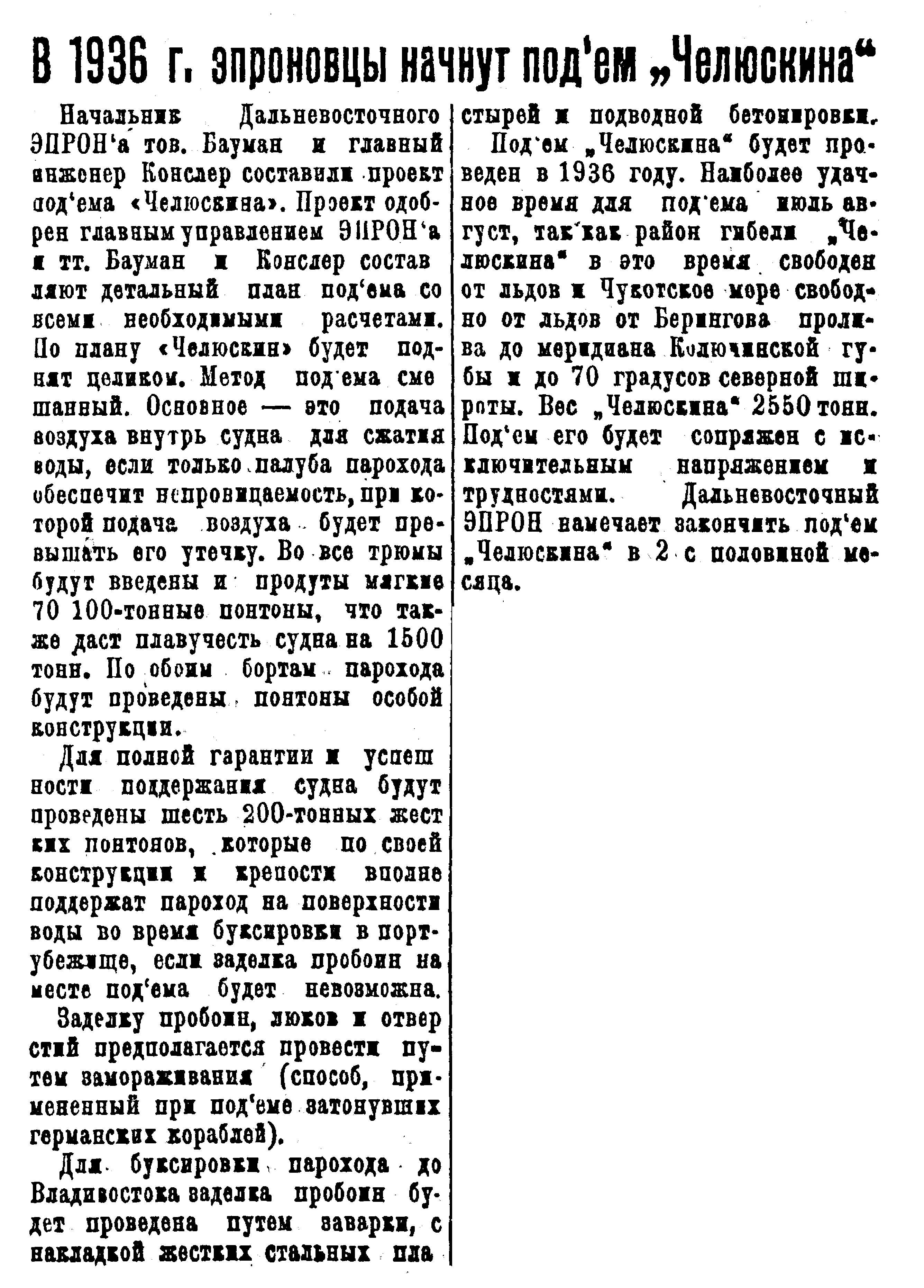 Начальник Дальневосточного ЭПРОНА тов. Бауман и главный инженер Конслер составили проект подъёма «Челюскина». Проект одобрен главным управлением ЭПРОНА а тт. Бауман и Конслер составляют детальный план подъёма со всеми необходимыми расчетами. По плану "Челюскин" будет поднят целиком. Метод подъема смешанный. Основное — это подача воздуха внутрь судна для сжатия воды, если только палуба парохода обеспечит непроницаемость, при которой подача воздуха будет превышать его утечку. Во все трюмы будут введены и продуты мягкие 70 - 100-тонные понтоны, что также даст плавучесть судна на 1500 тонн. По обоим бортам парохода будут проведены, понтоны особой конструкции.