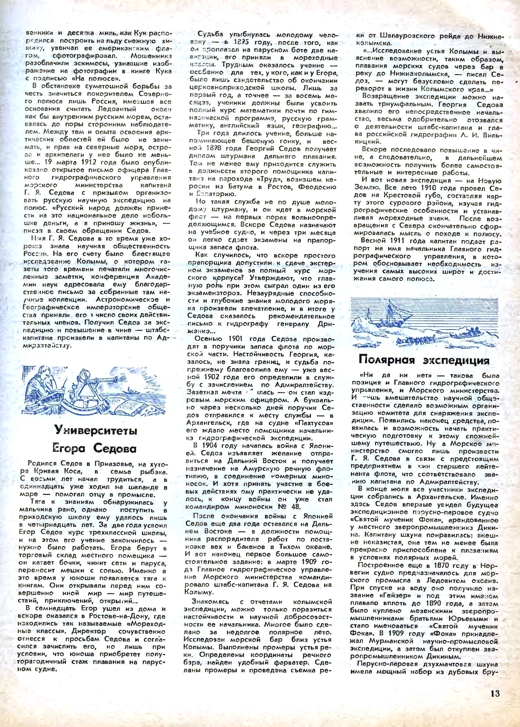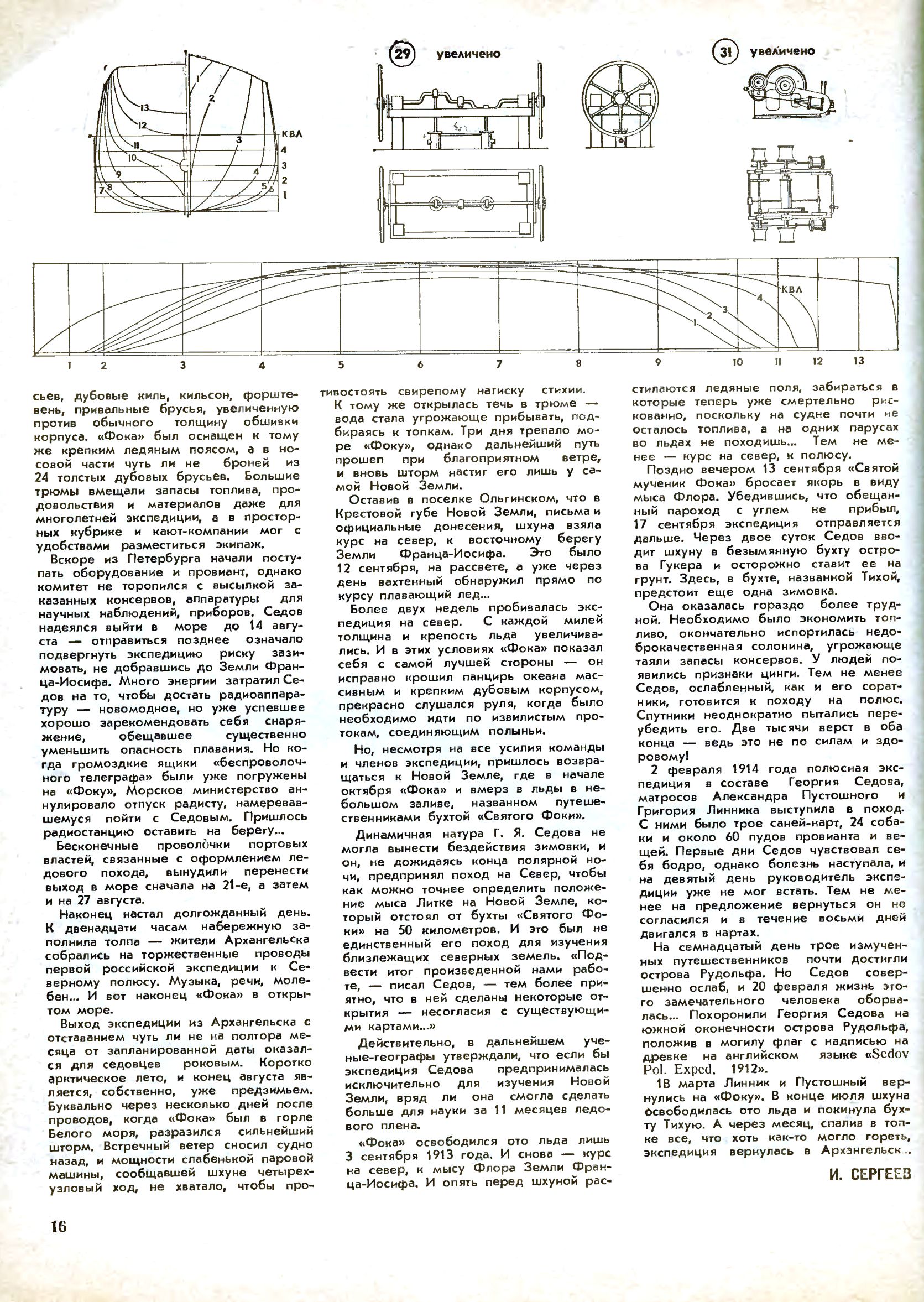 И.Сергеев. Северная Одиссея, или Последняя экспедиция лейтенанта Седова.// Моделист - конструктор,1986,№09...Однажды на мысе Аук острова Рудольфа, самого северного острова Земли Франца-Иосифа, среди обледенелых камней нашли деревянный шест с заостренным концом и медной муфтой, на которой сохранилась гравировка: «Sedov. Pol. Exped. 1912». Это был флагшток, который намеревался установить на «макушке» нашей планеты начальник экспедиции к Северному полюсу, старший лейтенант российского флота Г. Я. Седов...Штурм полюсаПервые в истории походы к Северному полюсу имели вполне конкретную цель: разработку северного маршрута из Атлантического в Тихий океан. Принципиальная возможность такого пути, казалось, подтверждалась научными разработками географов того времени. Они утверждали, что ледяные поля располагаются лишь в достаточно низких широтах, а стоит пересечь параллели Гренландии или Шпицбергена, и откроются просторы арктического океана...