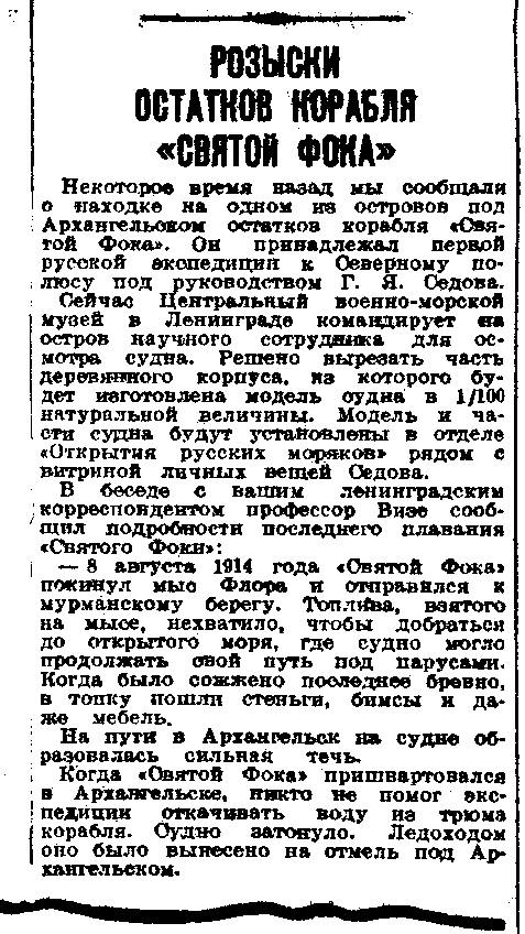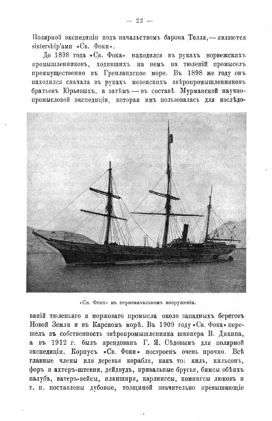 В конце июля все участники экспедиции собрались в Архангельске. Именно здесь Седов впервые увидел будущее экспедиционное парусно-паровое судно «Святой мученик Фока », арендованное у местного зверопромышленника Дикина. Капитану шхуна понравилась: внешне неказистая, она тем не менее была прекрасно приспособлена к плаваниям в условиях полярных морей.