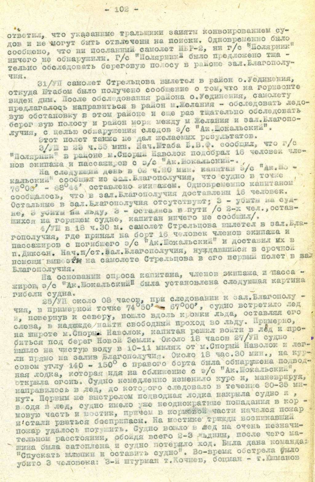 Катер отдал распоряжение спускать вручную. Спустить не могли. Левую шлюпку обрубили, она упала; правая у нас загорелась. Рабочую шлюпку разбило снарядом. Поэтому каждый, находясь со спасательным поясом, пошли в воду, доплыли до льдины и там остались. Подлодка не прекращала бить по мостику все время. Потом перенесла огонь на льдины – там убило снарядом т.т.Футерман и моториста Грачева. Очень много стреляли по льду и из пулеметов и автоматов. Прекратили стрелять по льду и перенесли огонь на судно (из 45-мм пушек). На мостике, кроме капитана, почти ничего не осталось и не уцелело. Со льда начали кричать: «Капитан, не оставайся – уходи!» Я судно оставил, прыгнул в воду и плыл к шлюпке. В шлюпке были Большаков, Геворкянц и Бик. Мы начали отгребать. Шлюпка была между корпусом и лодкой. Подлодка начала обстреливать нашу шлюпку. Мы шлюпку бросили и направились вплавь – кто куда мог. Я и Геворкянц оказались на небольшой льдине, на которой мы пролежали, т.к. притаиться было больше негде. Большаков со льдины перешел на шлюпку. Лодка обошла льдины, заметила шлюпку и люди с подлодки начали требовать у Большакова «папир» - документы. Большаков вытащил документы и подал. Они начали спрашивать название судна. Он кричал: «Академик Шокальский!» Они потребовали от него спасательный пояс от шлюпки. Взяли, посмотрели и бросили обратно. Потом приказали ему подвязать потуже свой спасательный пояс, затем разогнали подлодку, ударили форштевнем в шлюпку и перевернули ее.
