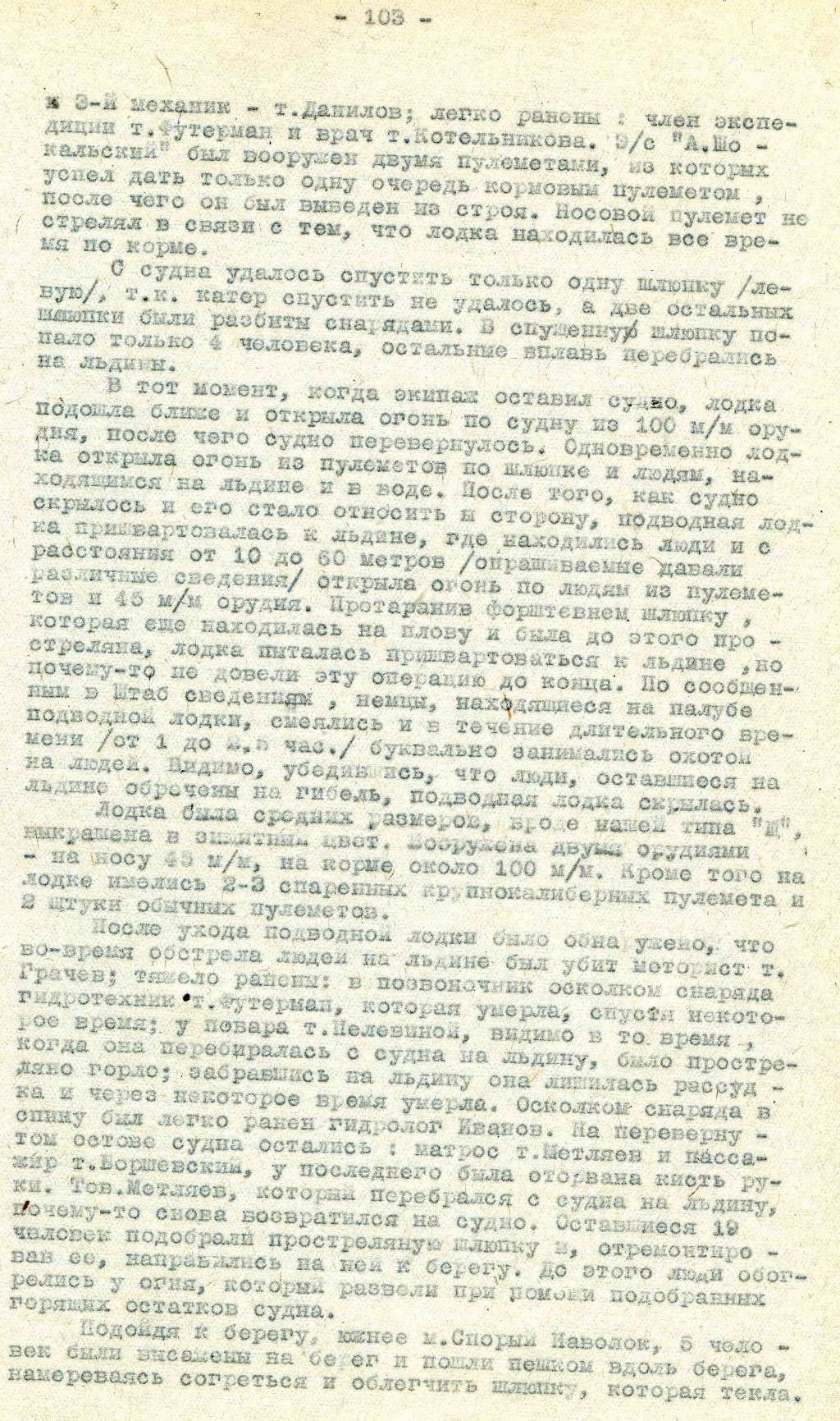 О.: Да, совершенно определенно. В расстоянии 60 метров в упор стреляли в людей. Характерно, что те двое (Футерман и Грачев), которые были убиты, были защищены большими льдинами, но снаряды накрыли их. Их даже не видели немцы, как цель, но в них попали. Также стреляли из пулеметов (у повара Пелевиной прострелили шею). Стреляли по шлюпке. В ней первое время находились Бик, Большаков, Геворкянц и я держался за шлюпку в воде. Когда они начали стрелять по шлюпке, мы все врассыпную по льдинам. Совершенно определенно, что немцы стреляли по людям, чтобы их уничтожить.