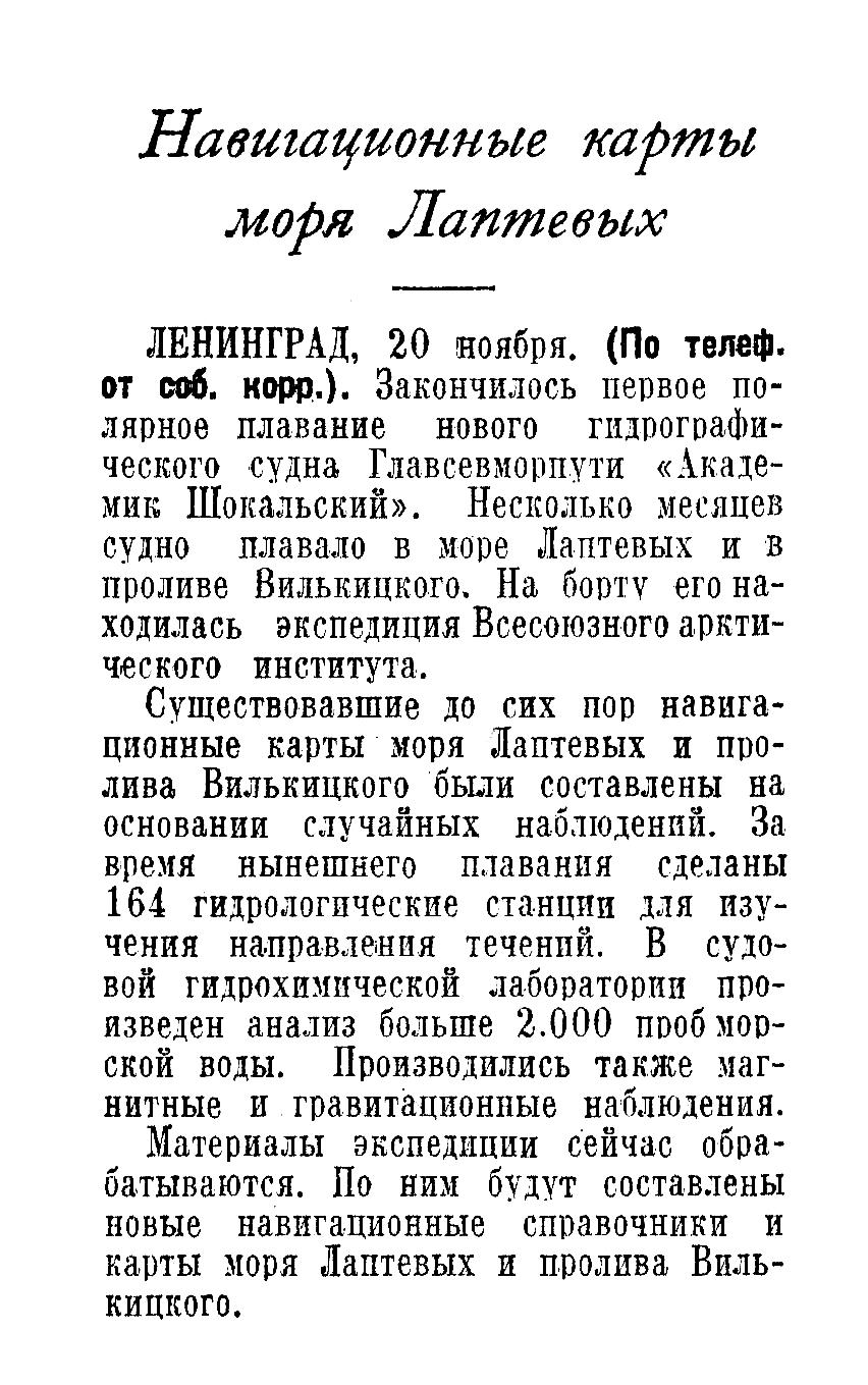 ЛЕНИНГРАД, 20 ноября. (По телеф. от соб. корр.). Закончилось первое полярное плавание нового гидрографического судна Главсевморпути «Академик Шокальский». Несколько месяцев судно плавало в море Лаптевых и в проливе Вилькицкого. На борту его находилась экспедиция Всесоюзного арктического института.