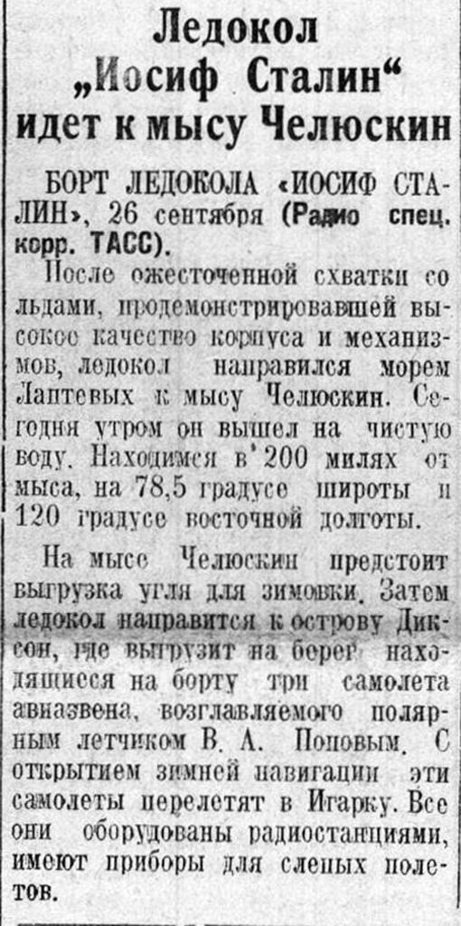 БОРТ ЛЕДОКОЛА «ИОСИФ СТАЛИН», 2 сентября. (Спец. корр.ТАСС). Сегодня в 8 часов утра были на траверзе мыса Нордкап — самой северной оконечности европейского материка.