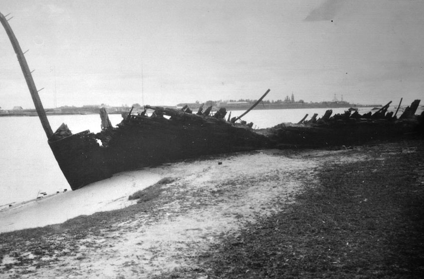 Поставленный на случайную стоянку, корабль был унесен ледоходом на остров и разломан. Постепенно его засыпало песком. Однако части крепкой деревянной обшивки и форштевня сохранились.