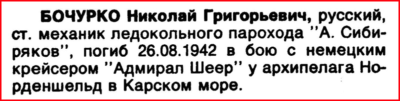 25 августа 1942 года, 60 лет тому назад, фашистский рейдер «Адмирал Шеер» (тяжелый крейсер) во время неравного боя у острова Белуха в Карском море потопил этот знаменитый ледокольный пароход. Моряки, открыв кингстоны, затопили объятое пламенем судно, но флаг не спустили – не отдали корабль во вражеские руки. Погибло около ста человек – моряков и сотрудников полярной станции на островах Северная Земля, куда пароход с грузом и направлялся. Фашистский катер отбуксировал полузатопленную шлюпку с 19-ю сибиряковцами, которые были или тяжело ранены или контужены, к борту крейсера. Среди них были раненные капитан А.А. Качарава, старшина радистов, парторг парохода М.Ф. Сараев и ледовый разведчик, сотрудник ААНИИ, А.С. Золотов. Многие моряки отказывались перебираться из воды в шлюпку – фашисты их просто расстреливали.