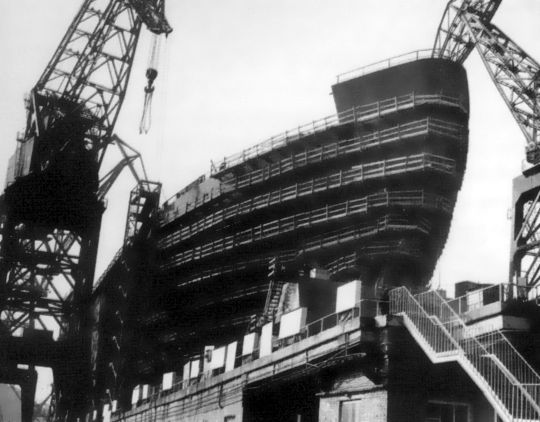 Атомный ледокол проекта 10521 "Россия" в период строительства на восточном стапеле Балтийского завода (слева) и во время спуска на воду 2 ноября 1983 года