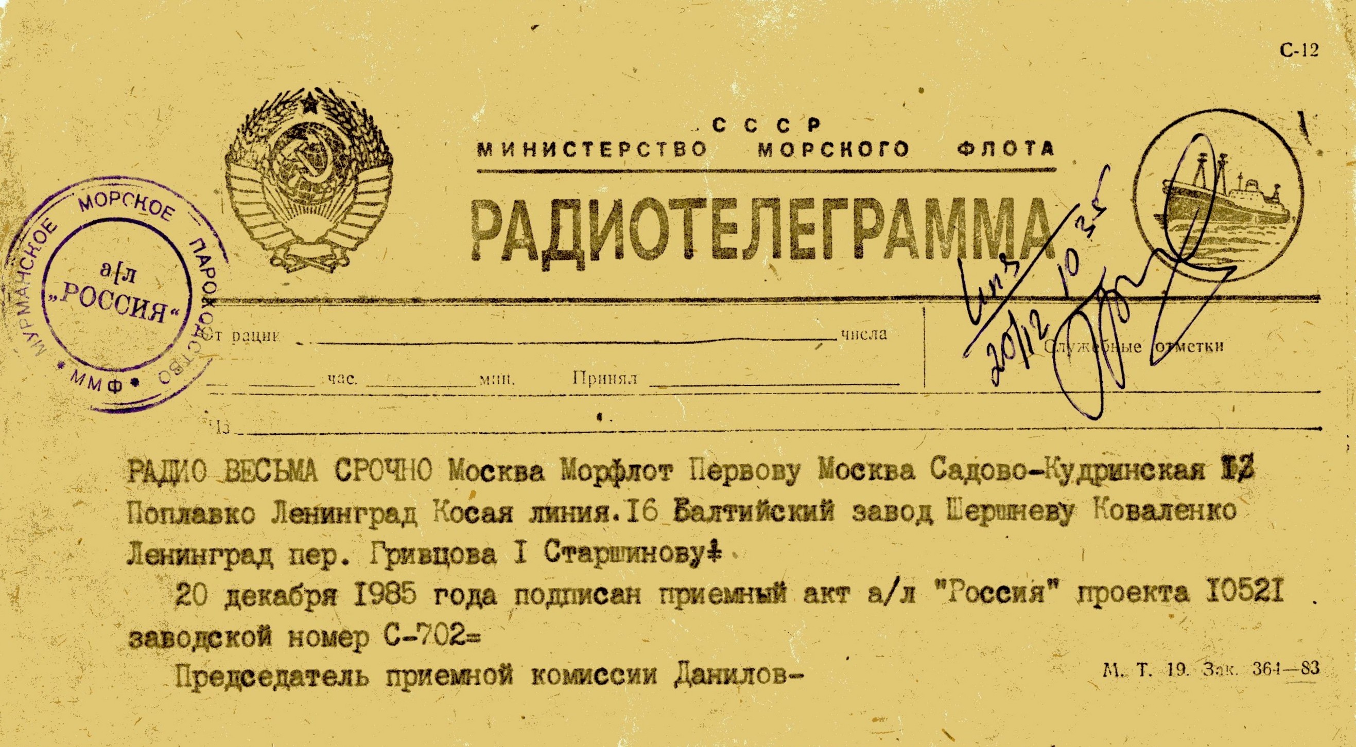 :": ... Вложил памятную РДО, отправленную с рейда Таллина о приемке "России". Кто такой "Первый" не ведаю, а Старшинов - начальник ЦКБ "Айсберг" в тот момент, т.е. проектировщик всех атомных ледоколов, начиная с "Ленина". Естественно, в ЦКБ проектирование ледоколов было делом второстепенным.
