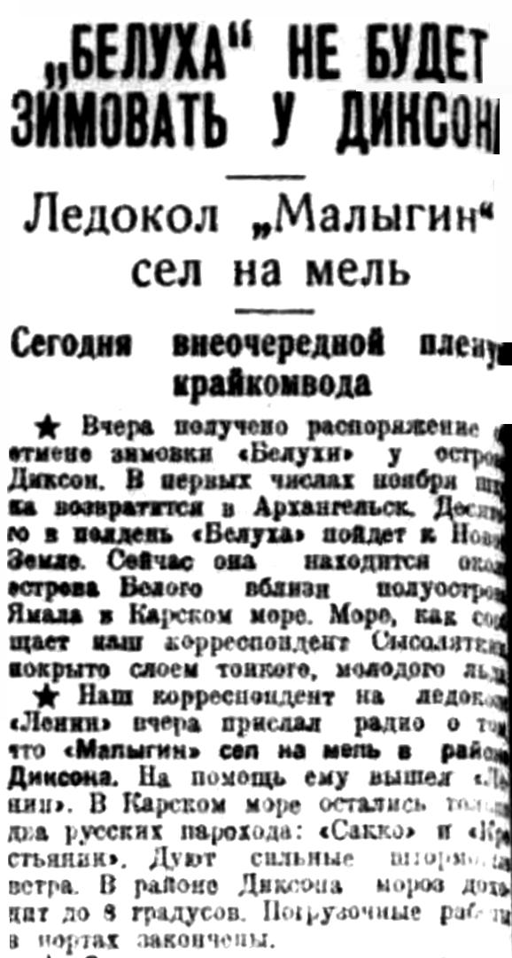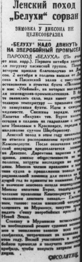 ПАРОХОД "БЕЛУХА" (По радио от наш корр.). Первого октября закончили погрузку пясинской группы. Поздним вечером пришли благополучно на Диксон. 2 октября в полдень вышли от Диксона в Пясинский залив с попутными остановками в пунктах бухта "Полынья" и мыс "Убойный", на которых высаживали зимовщиков-промышленников. В бухте появилось сало, вода имеет отрицательную температуру — признак скорого замерзания бухты. Идем в скверной видимости. Снежные заряды, качка. Капитан "Белухи" тов. Бурке вылетел сегодня в полдень на гидроплане с летчиком Ивановым в Красноярск, передав командование судном Шарбаронову.