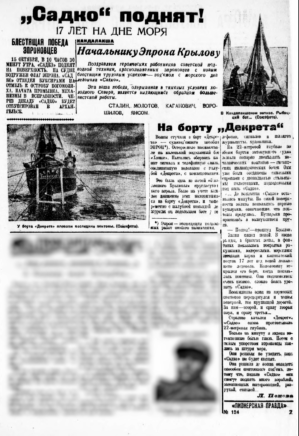 ВОДРУЖЕН ФЛАГ ЭПРОНА. «САДКО.» ОТВЕДЕН БУКСИРАМИ НА ОТМЕЛЬ К ОСТРОВУ БОГОМОЛИХА. НАЧАТА ПРОМЫВКА, МЕХАНИЗМЫ В ИСПРАВНОСТИ. ЧЕРЕЗ ДЕКАДУ «САДКО» БУДЕТ ОТБУКСИРОВАН В АРХАНГЕЛЬСК.