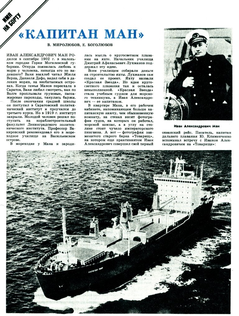 ИВАН АЛЕКСАНДРОВИЧ МАН Родился в сентябре 1902 г. в маленьком городке Горки Могилевской губернии. Откуда появилась любовь к морю у человека, никогда его не видевшего? Ваня взахлеб читал Жюля Верна, Даниеля Дефо, видел себя в далеких морях, на необитаемых островах. Когда семья Маков переехала в Саратов, Ваня любил смотреть, как по Волге проплывали грузовые, пассажирские пароходы, тянулись баржи.