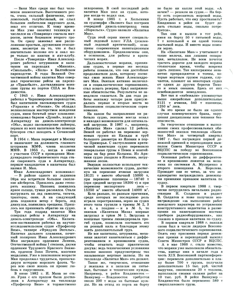 На каком бы направлении ни работало судно, экипаж всегда искал и находил возможности для оптимальной загрузки. В 1987 г., например, «Капитан Ман» сделал 12 рейсов. Зимой он работал на перевозке зерновых грузов из Канады и труб большого диаметра из Японии в порты Приморья. С наступлением арктической навигации судно перевозило генеральные грузы в Певек и контейнеры на бар реки Колымы. Из Арктики судно уходило в Японию, загруженное лесом.