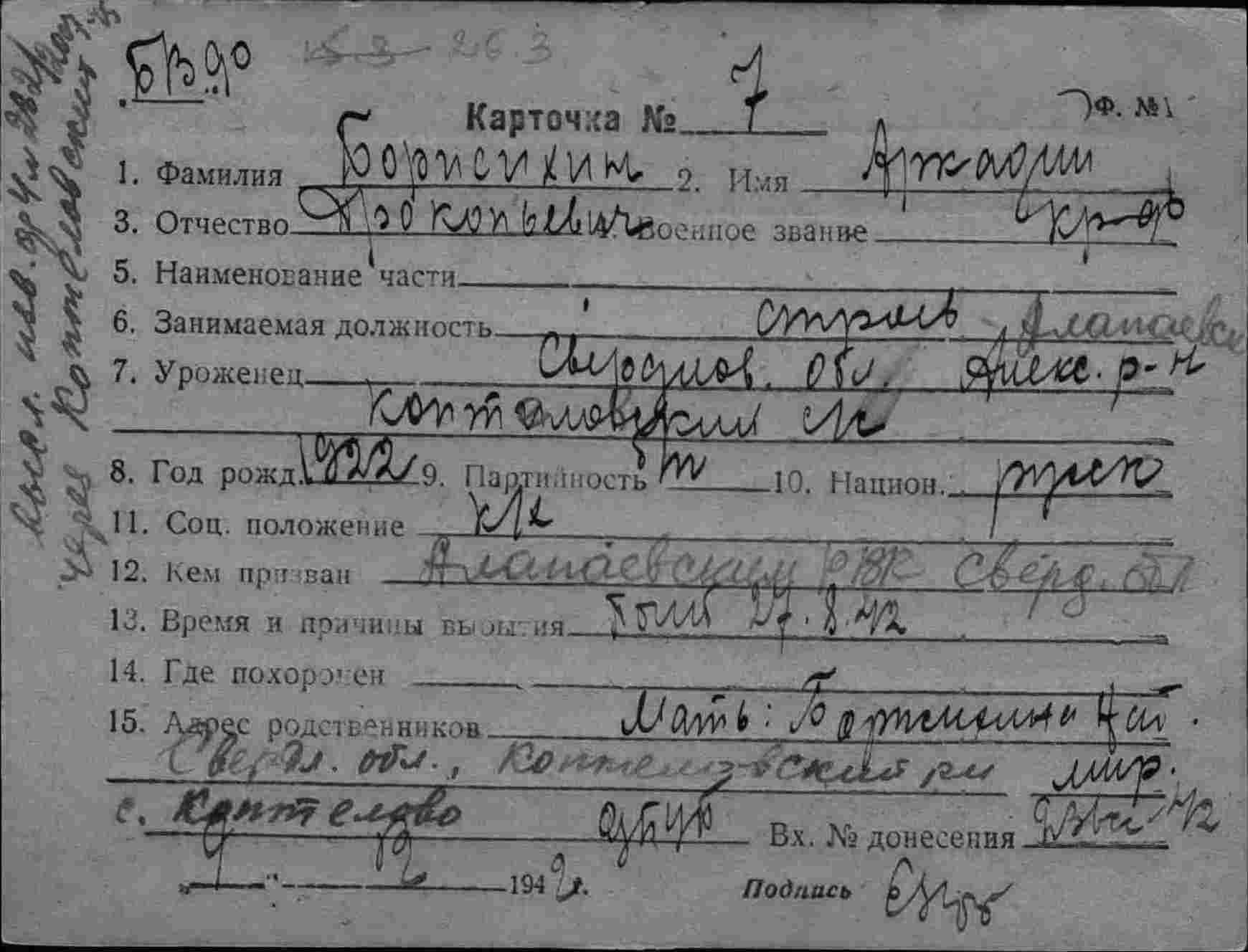 Краснофлотец Аркадий Прокофьевич Борисихин. Это он, сидя за дальномером, хладнокровно докладывал артиллеристам дистанцию до «Адмирала Шеера», видел направленные оттуда, кажется именно на него, Борисихина, стволы тяжелых орудий, видел вылетающие из них языки желтого пламени и знал, что все это несет смерть. Но он продолжал глядеть в окуляры, измерять дистанцию и с великой радостью отмечал, что наши снаряды достигают цели... Не суждено было ему лишь увидеть, как отступал враг.