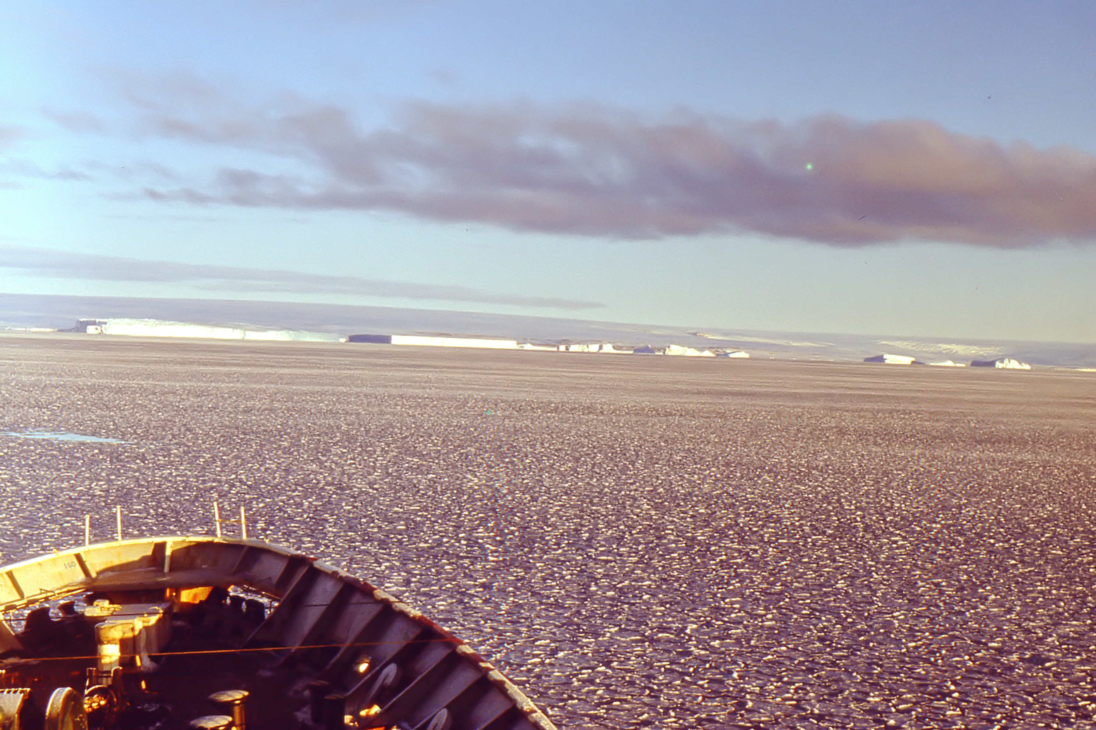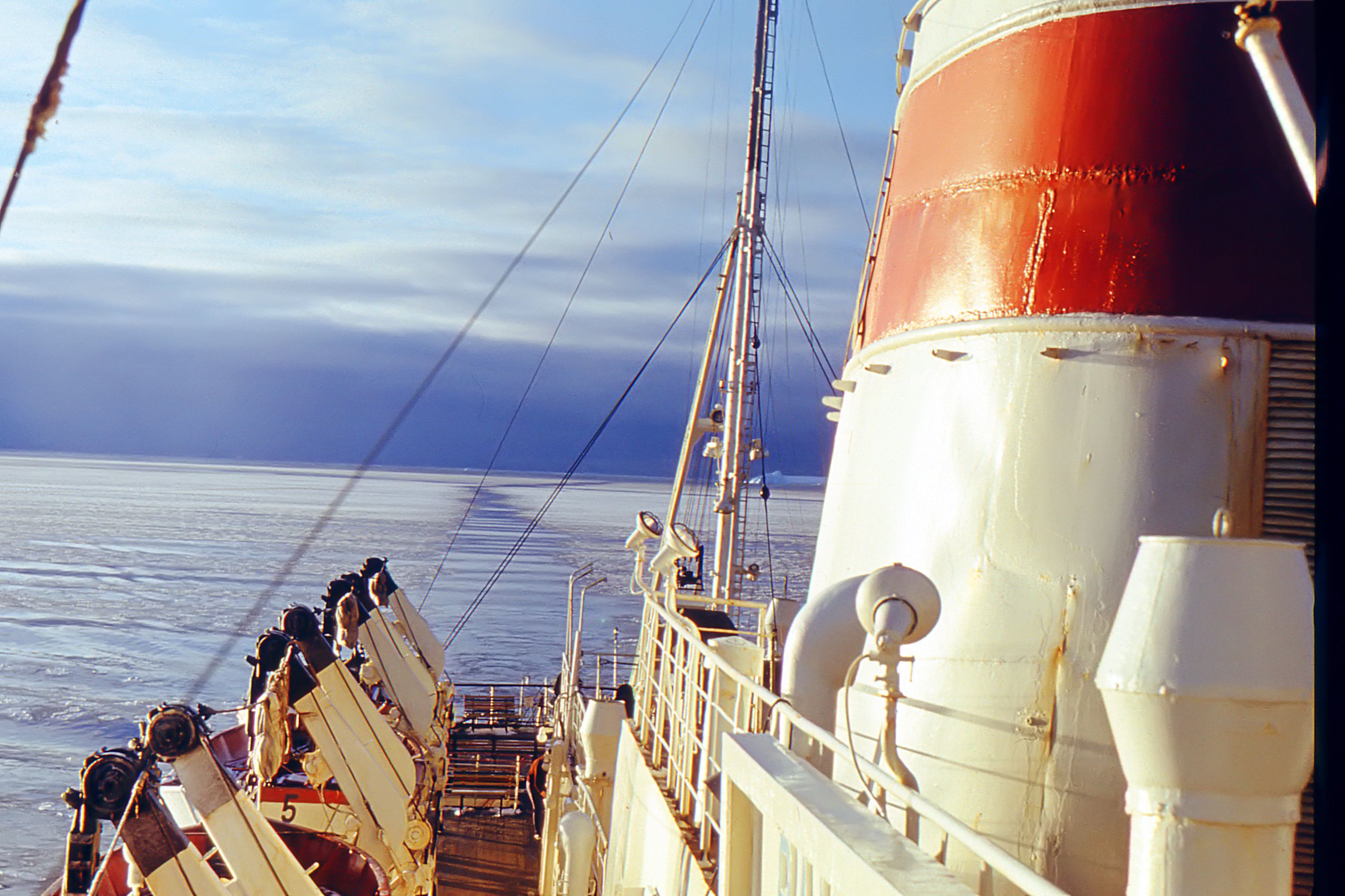 Около полудня 1 января подходим к зазубренной кромке разреженного льда на меридиане АМЦ (Антарктический метеорологический центр). Малым ходом, обходя обломки больших полей, следуем на юг. На ходовом мостике усиленная вахта: два матроса, два штурмана, не считая меня, практически не покидающего последние дни рубку. Все в черных очках. Без них невозможно смотреть вперед — нестерпимо яркая белизна отраженного ото льда света. Кое у кого уже загорели руки и лица. Предупреждаем новичков, что могут быть и солнечные ожоги.