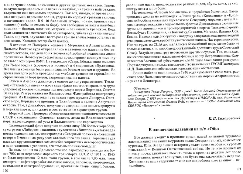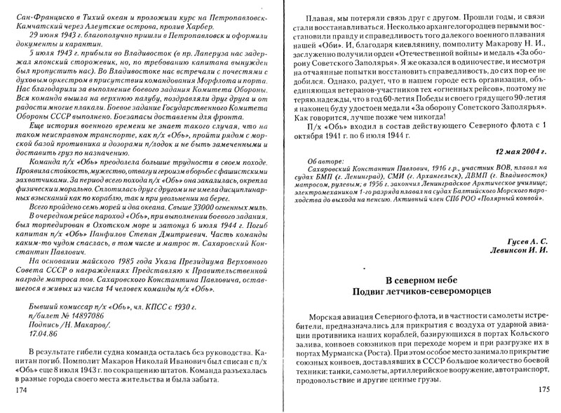 На север попал в июне 1942 года. На пароход «Обь» пошел добровольцем в ноябре 42-го. Плавание на «Оби» для меня было и есть самым тяжелым и ярким воспоминанием о войне. И когда я, вступив в общественную организацию «Полярный конвой», получил предложение написать воспоминания, то решил приложить к своим скромным воспоминаниям копию «Политдонесения» помполита п/х «Обь» Николая Ивановича Макарова, отправленного им весной 1986 года в Генштаб Министерства обороны.