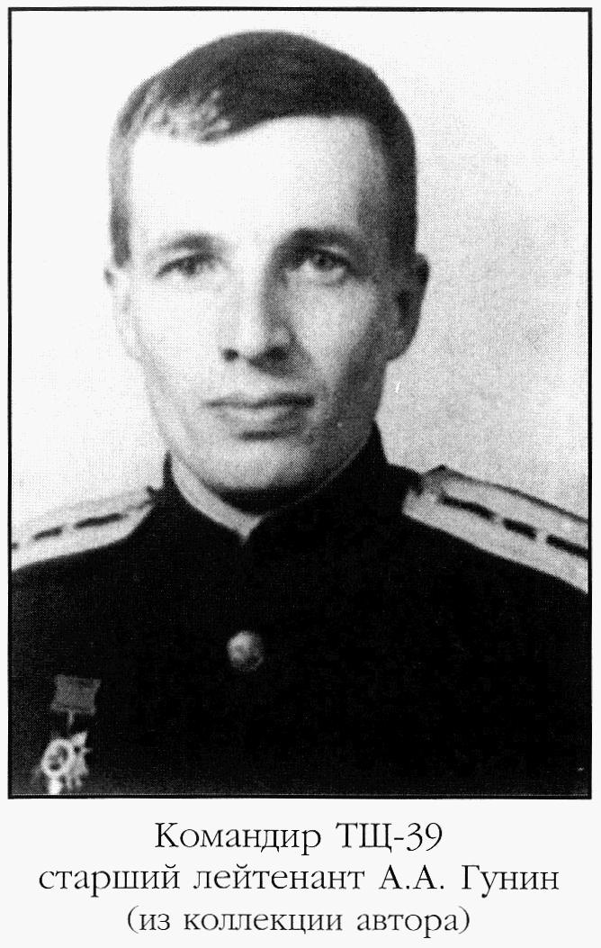 1 августа 1942 года на подходах к о. Междушарский с ТЩ-39 обнаружили пароход на курсовом углу левого борта 40°. Дистанция до него составляла 80 каб. Через 20 минут судно закрыло нашедшим туманом, а в 01.18 на ТЩ-39 услышали взрыв. Вначале старший лейтенант Гунин решил, что пароход по какой-то причине произвел выстрел из артиллерийского орудия, но затем изменил свое мнение. Причиной этому стал доклад, поступивший из машинного отделения, личный состав которого отчетливо слышал подводный взрыв. Стало ясно, что обнаруженный ранее пароход, скорее всего, торпедирован подводной лодкой противника. Однако понимание этого не заставило Гунина изменить курс для оказания помощи терпящим бедствие. Тральщик продолжал следовать по назначению.