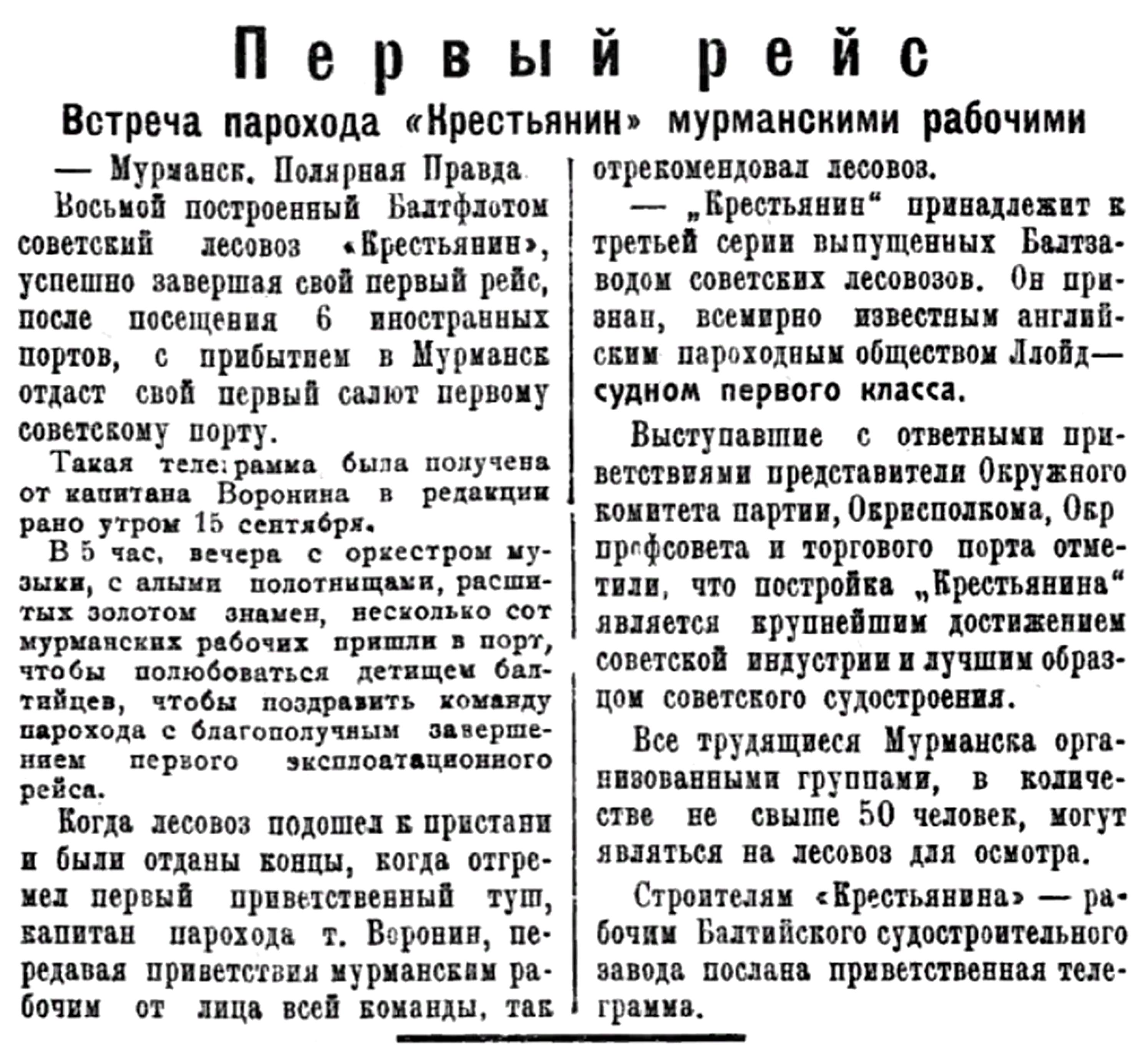 22 августа экипаж парохода "Крестьянин" был взят на борт ТЩ-39 (быв. рыболовный траулер РТ-16 "Ленин") и 26 августа доставлен в Архангельск.{55}