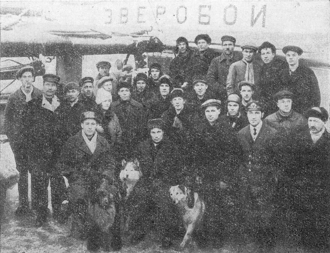 В прошлом году «Зверобой» прошел здесь впервые, не встретив льда, основал здесь зимовье, оставил девять человек, продовольствие и верных друзей человека—сибирских собак.