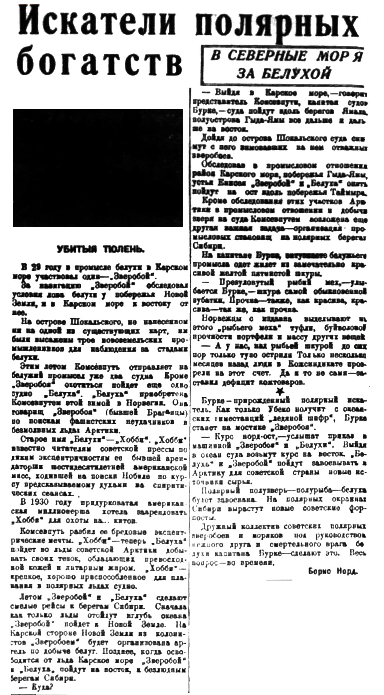— Курс норд-ост, — услышат приказ в машинной "Зверобоя" и "Белухи". Выйдя в океан суда возьмут курс на восток. "Белуха" и "Зверобой" пойдут завоевывать в Арктику для советской страны новые источники сырья.