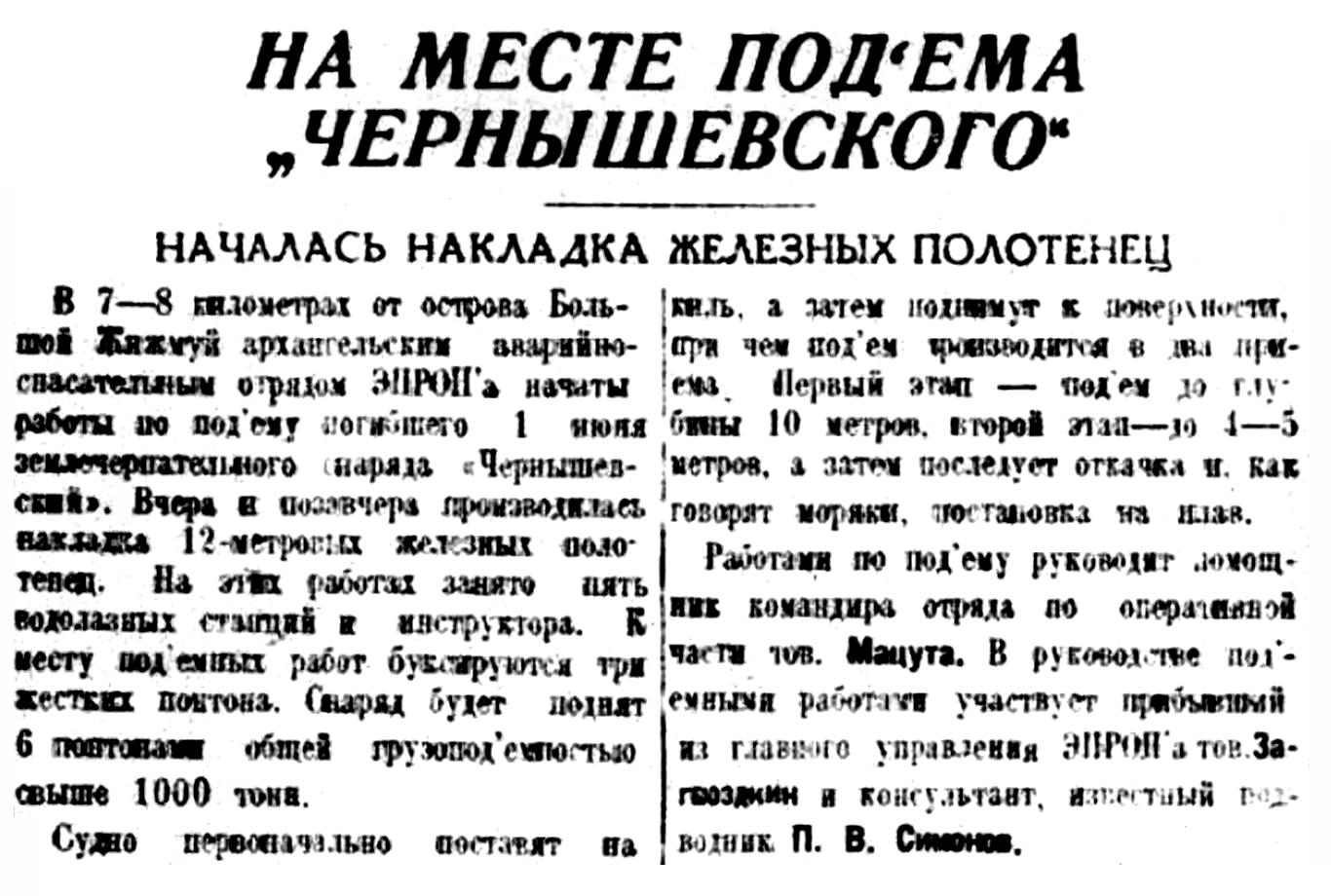 Новоселова, земснаряд "Чернышевский" второго июня уже прошел самый опасный район, где волны достигают наибольшей силы, а именно, Двинскую губу. "Чернышевского" видели у острова Жижгин с парохода "Карелия", а также с Жижгинского маяка. Каких-либо позывных сигналов о помощи "Чернышевский" не подавал. Продвигался он собственным ходом, так как имел сильную машину. Есть предположение, что "Чернышевский" погиб в треугольнике между островами Жижгин, Соловецкий и Жужмуй. Здесь попеременно дули ветры от северного до южного. Трупы 15 моряков выброшены морем в юго-западной стороне Малого Жужмуя и были разбросаны на протяжении двух километров. Если удастся установить определенный участок аварии, то здесь будут работать два буксира тралами.