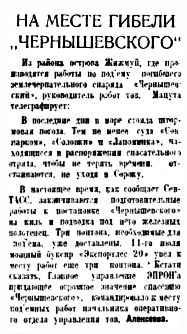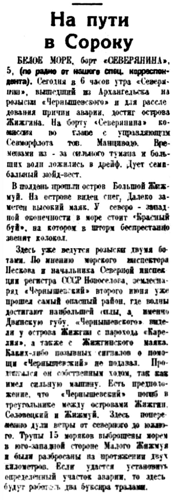 БЕЛОЕ МОРЕ, борт "СЕВЕРЯНИНА". 5, (по радио от нашего спец. корреспондента). Сегодня в 6 часов утра "Северянин", вышедший из Архангельска на розыски "Чернышевского" и для расследования причин аварии, достиг острова Жижгина. На борту "Северянина" комиссия во главе с управляющим Севморфлота тов.