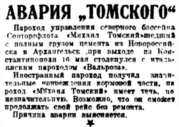 Пароход управления северного бассейна Совторгфлота "Михаил Томский" шедший с полным грузом цемента из Новороссийска в Архангельск. при выходе из Константинополя 16 мая столкнулся с итальянским пароходом "Вальроза".