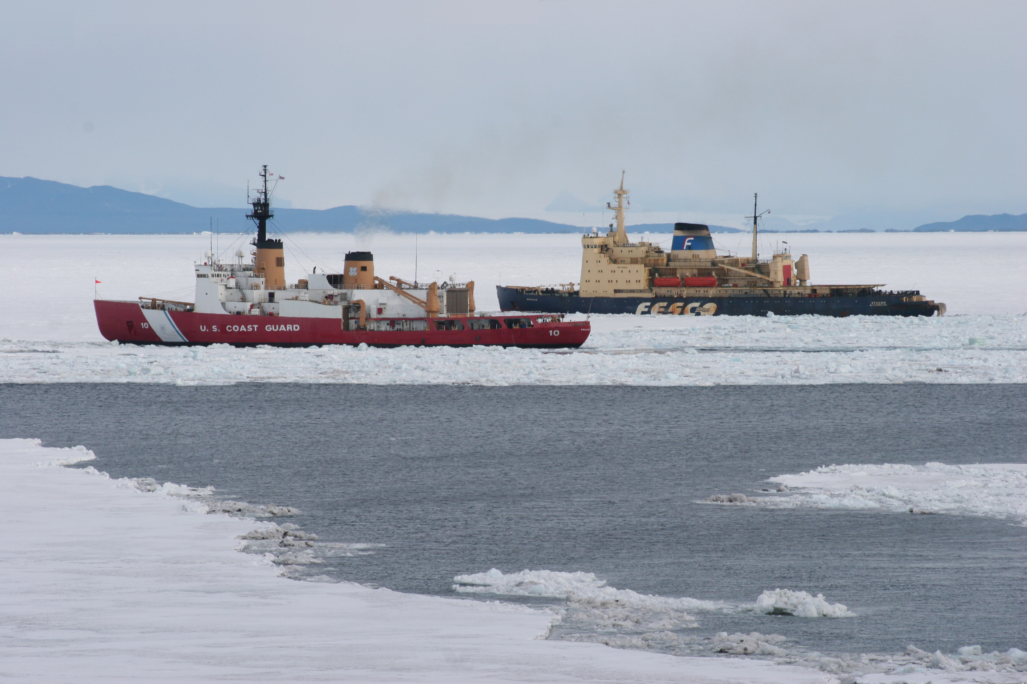 "Традиционно ледовая проводка судов, обеспечивающих полярную станцию "Мак-Мердо" всем необходимым, осуществляется двумя ледоколами Береговой охраны США "Polar sea" и "Polar star", мощность которых в несколько раз ниже мощности "Красина". В этом году из-за ухудшения ледовой обстановки, а также поломки одного из ледоколов и угрозы блокады станции, было принято решение о срочном направлении в Антарктиду российского ледокола. Теперь и второй американский ледокол вышел из строя", - сообщил Чилингаров.