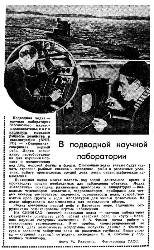 Подводная лодка — научная лаборатория Всесоюзного научно-исследовательского института морского рыбного хозяйств и океанографии (ВНИРО) — «Северянка» совершила первый рейс. Лодка специально переоборудована для изучения морских и океанических вод дна, морской фауны и флоры. С помощью лодки ученые будут изучать строение рыбных косяков и поведение рыбы в различных условиях, работу промысловых орудий лова, вести океанографические наблюдения.