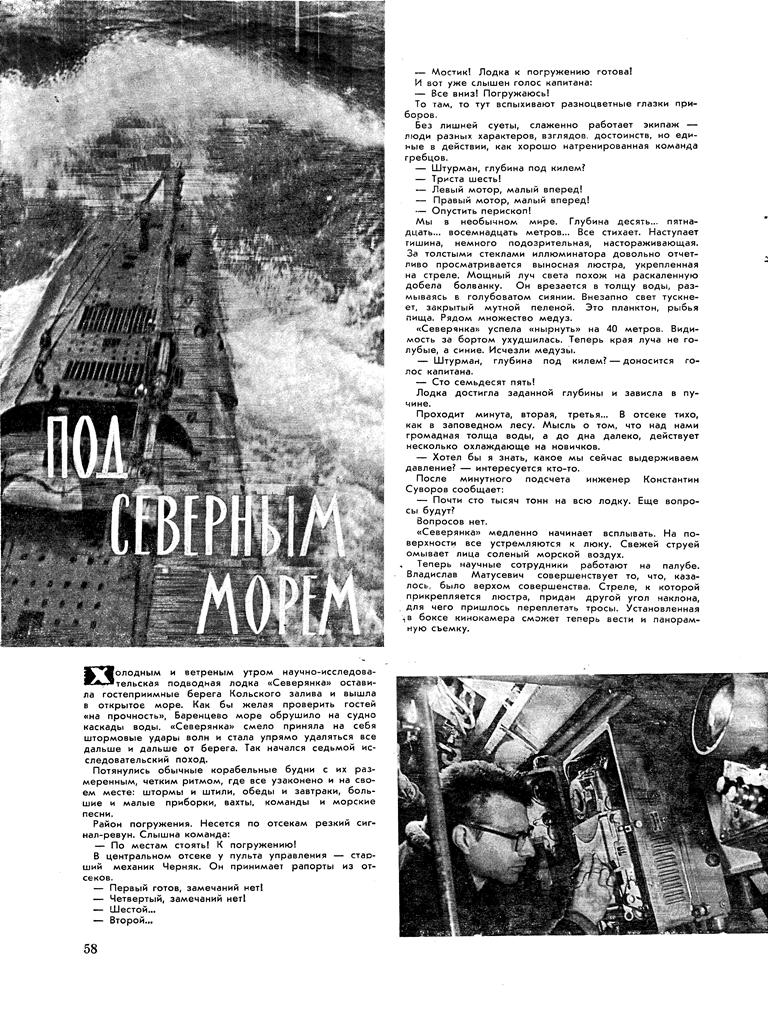 НА СНИМКАХ: (вверху) подводная лодка — научная лаборатория «Северянка» совершает свой первый северный рейс. В кругу — младший научный сотрудник экспедиции В. А. Фомин начал работу у электронного термосолемера. Этот прибор, сконструированный во ВНИРО, дает возможность непрерывно получать данные о температуре и солености забортной воды на различных глубинах. Внизу справа — старший научный сотрудник экспедиции О. А. Соколов у подводного телевизора.