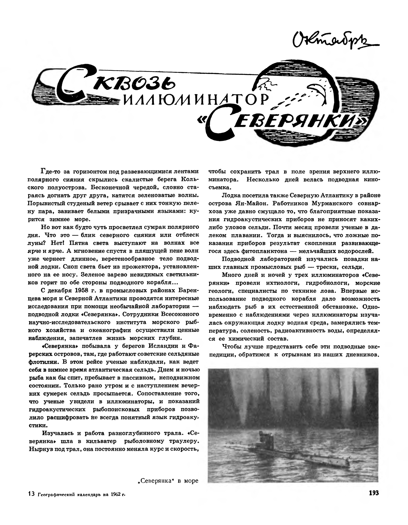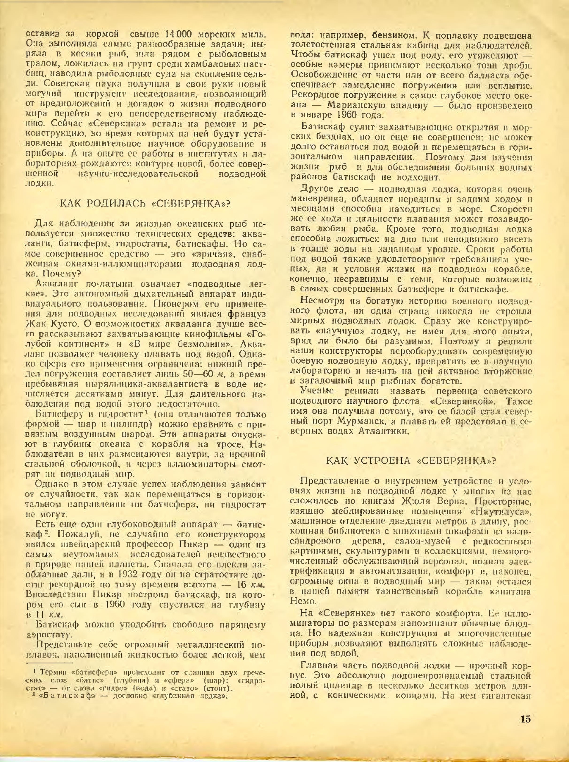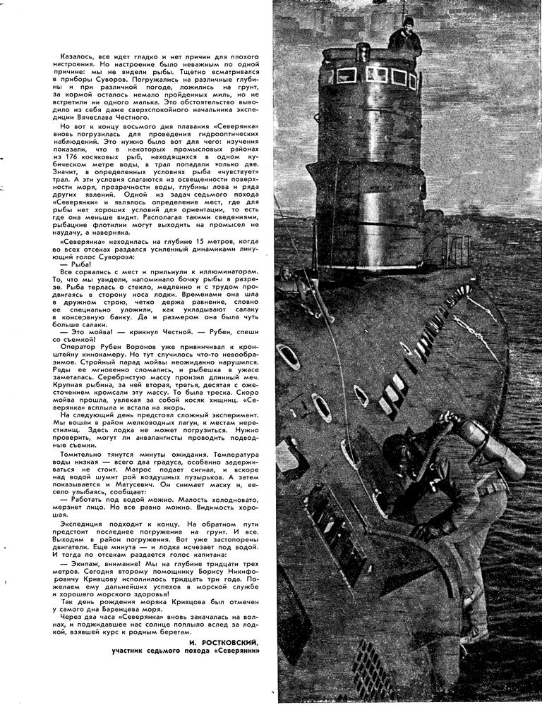 ными глазами. Любопытно в этом отношении высказывание французского журнала «Сьянс э Авенир»: «Большая заслуга Советского Союза в том, что он первый — да, первый — вышел за пределы обычных океанографических исследований на поверхности. «Северянка» удивила океанографию, начав изучение моря «в» самом море, а не только «на» море. Она предприняла наблюдение рыбных косяков, спустившись к самим рыбам... »