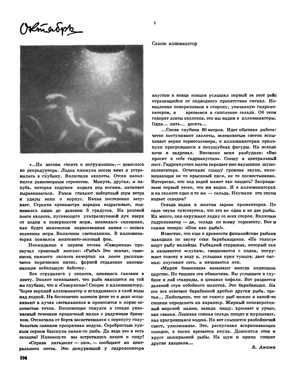 Производили кино-фотосъемку, однако с малой надеждой на результаты: все-таки темно. В течение ночи провели несколько экспериментов по определению реакции сельди на свет и тьму. Совершенно неожиданно для нас гидроакустик Васильев обратил внимание на необычные звуки, которые воспринимались судовым шумопеленгатором в моменты нахождения лодки среди сельди. Это явно были звуки, издаваемые сельдью. Они напоминали крысиный писк. Мы их немедленно зафиксировали на магнитофонную ленту. Плотность косяков была значительно выше, чем в предыдущих случаях. Это позволило гидроакустику дважды только по принятым звучаниям определить приближение очередных косяков сельди. Еще одной особенностью этой ночи является то, что под слоем сельди, в котором мы работали, эхолотом периодически обнаруживались расположенные на больших глубинах сравнительно