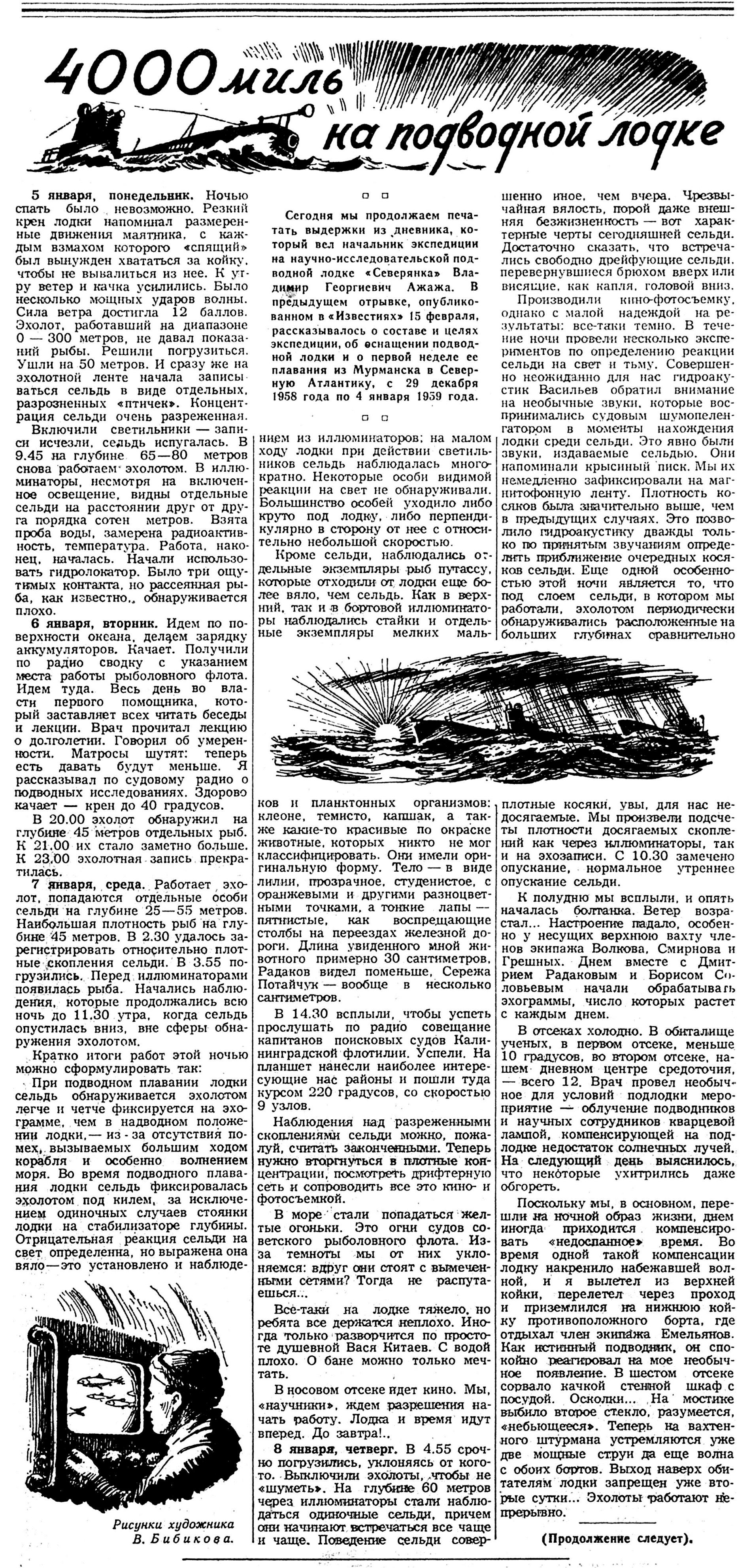 В двух предыдущих отрывках из дневника начальника экспедиции на подводной лодке «Северянка» В. Г. Ажажа, опубликованных в «Известиях» 15 и 17 февраля, рассказывалось о плавании из Мурманска в Северную Атлантику и о начале научно-исследовательских работ в районе между Исландией и Фарерскими островами. 8 января 1959 года, когда «Северянка» шла на сближение с рыболовным траулером «Профессор Месяцев» и вела эхолотом поиск сельди, снова разразился шторм.