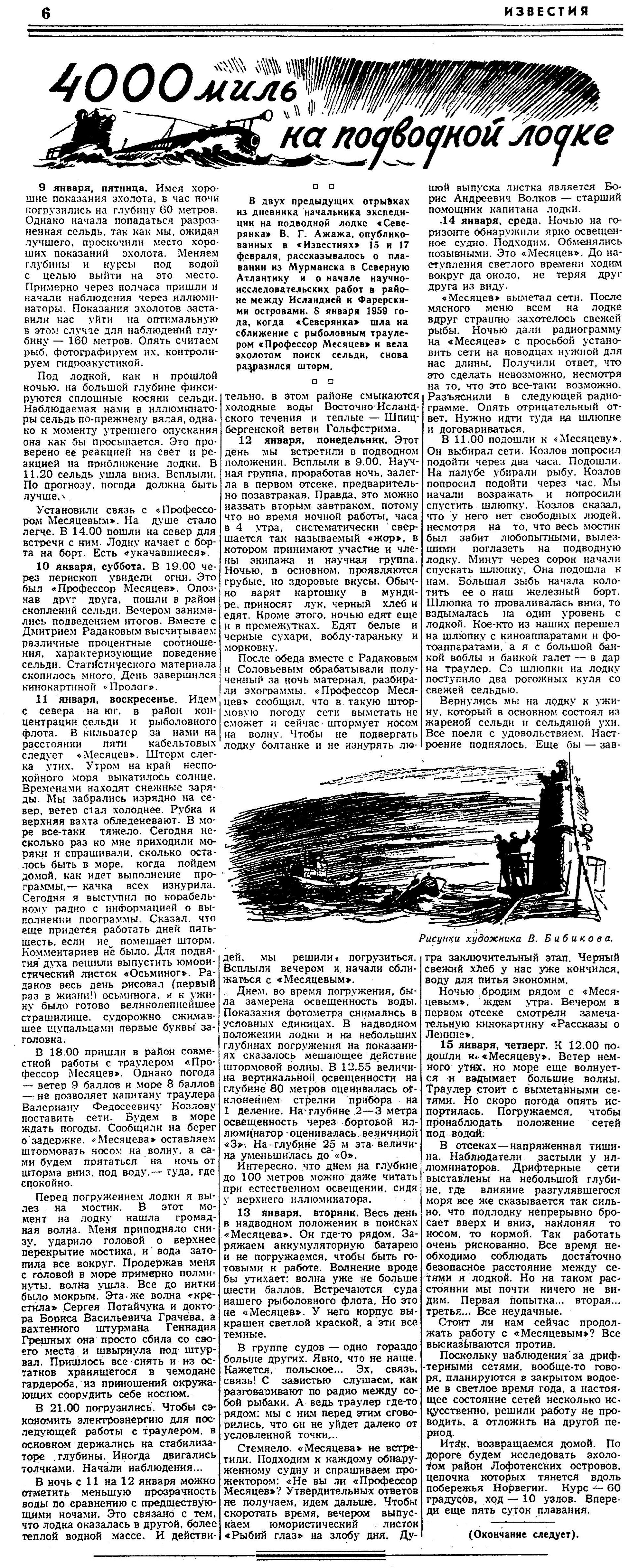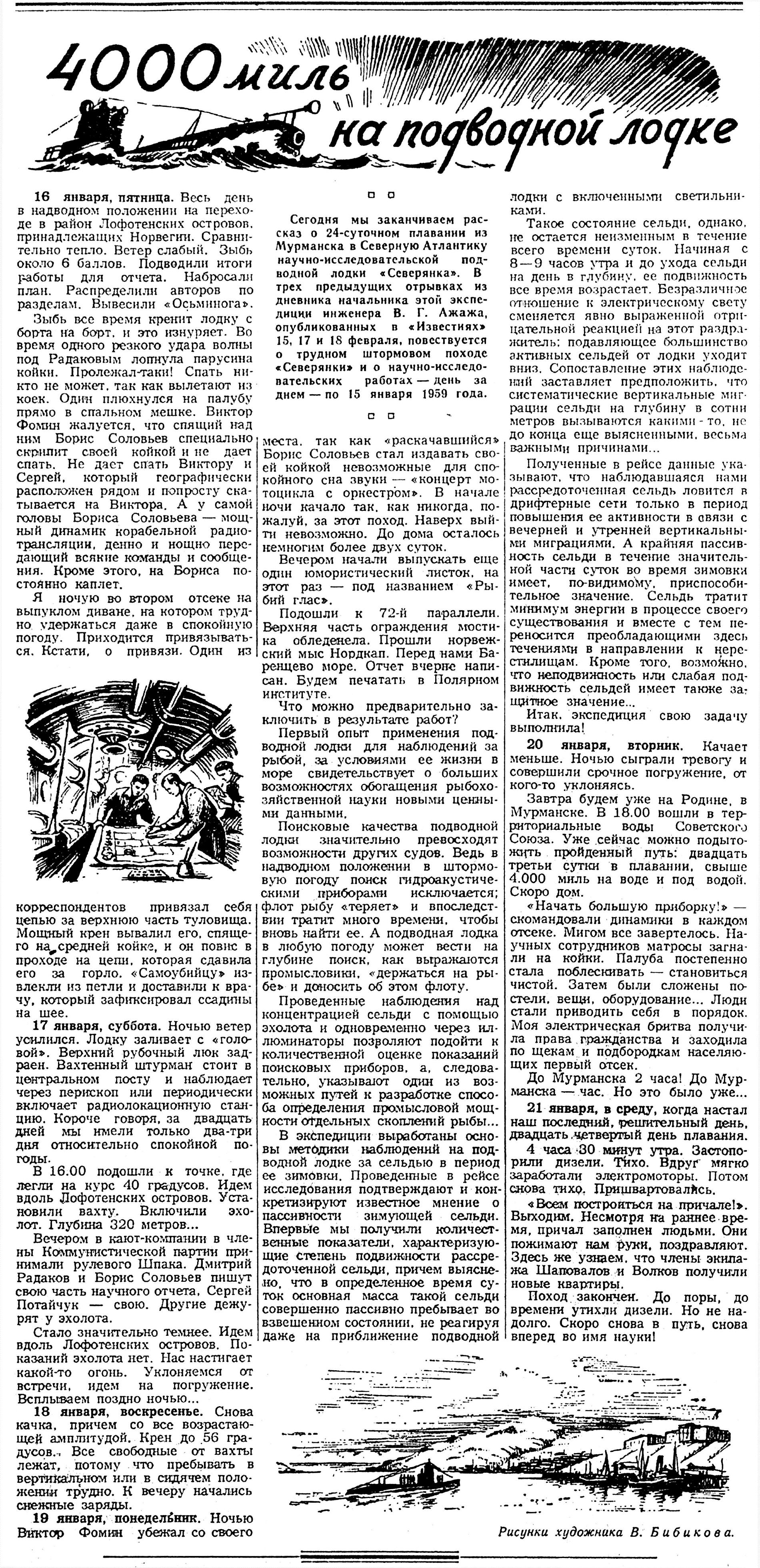 Сегодня мы заканчиваем рассказ о 24-суточном плавании из Мурманска в Северную Атлантику научно-исследовательской подводной лодки «Северянка». В трех предыдущих отрывках из дневника начальника этой экспедиции инженера В.Г. Ажажа, опубликованных в «Известиях» 15, 17 и 18 февраля, повествуется о трудном штормовом походе «Северянки» и о научно-исследовательских работах — день за днем — по 15 января 1959 года.