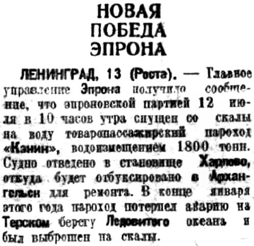 В конце января этого года пароход "Канин" потерпел аварию на Терском берегу Ледовитого океана и был выброшен на скалы. Для спасения парохода главное управление ЭПРОН отправило экспедицию в 70 человек. Во время аварии "Канин" получил большое повреждение в днище корпуса. Впервые в практике ЭПРОН'а, пришлось проделать работу по поднятию судна со скалы и по спуску его на воду.