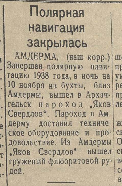 Заметка из газеты "Нарьяна-Вындер", № 258 (1983), от 14 ноября 1938 года (Ненецкий АО). К сожалению, пока по этому судну, ничего больше не нашёл. Может быть, это был эскадренный миноносец "Новик", который в 20-х годах переименовали в "Яков Свердлов", но судя по описаниям, он в это время находился на капитальном ремонте. 28 ноября 1937 года ветеран вновь возвратился для очередного ремонта (под заводским номером С-529) на место своего «рождения», в очередной раз переименованное: теперь бывшая Путиловская верфь, вошедшая в состав Наркомата оборонной промышленности, именовалась «Завод № 190 имени А.А.Жданова». И только в 40-м году ремонт был завершен. Может быть это было другое судно? А может он проходил испытание после ремонта в виде рейса до Амдермы и обратно?