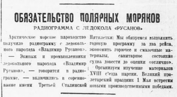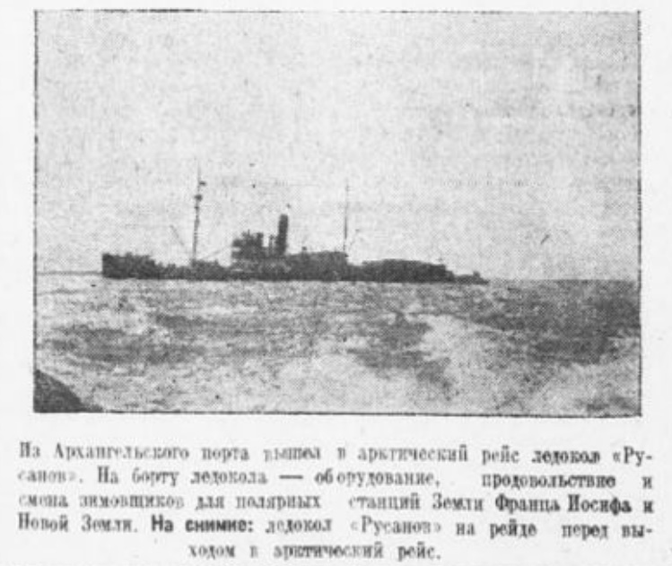 …В Главсевморпути имеются отдельные корабли, образцово работающие и отлично организовавшие команды на выполнение поставленных заданий. Так, например, помполит ледокольного корабля «Русанов» т.Стрекаловский сумел за время зимовки спаять коллектив. Здоровый коллектив «Русанова» обеспечил положительное полит.влияние и на команду других зимующих транспортных кораблей («Пролетарий» и «Рошаль»).