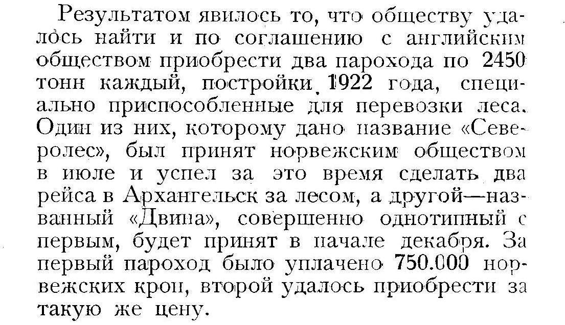Результатом явилось то, что обществу удалось найти и по соглашению с английским обществом приобрести два парохода по 2450 тонн каждый, постройки, 1922 года, специально приспособленные для перевозки леса. Один из них, которому дано название «Северолес», был принят норвежским обществом в июле и успел за это время сделать два рейса в Архангельск за лесом, а другой — названный «Двина», совершенно однотипный с первым, будет принят в начале декабря. За первый пароход было уплачено 750. 000 норвежских крон, второй удалось приобрести за такую же цену.